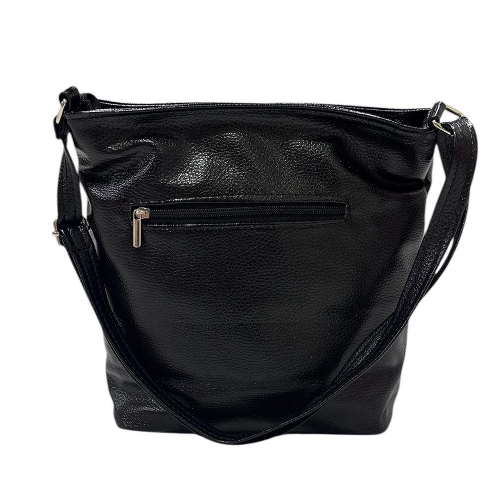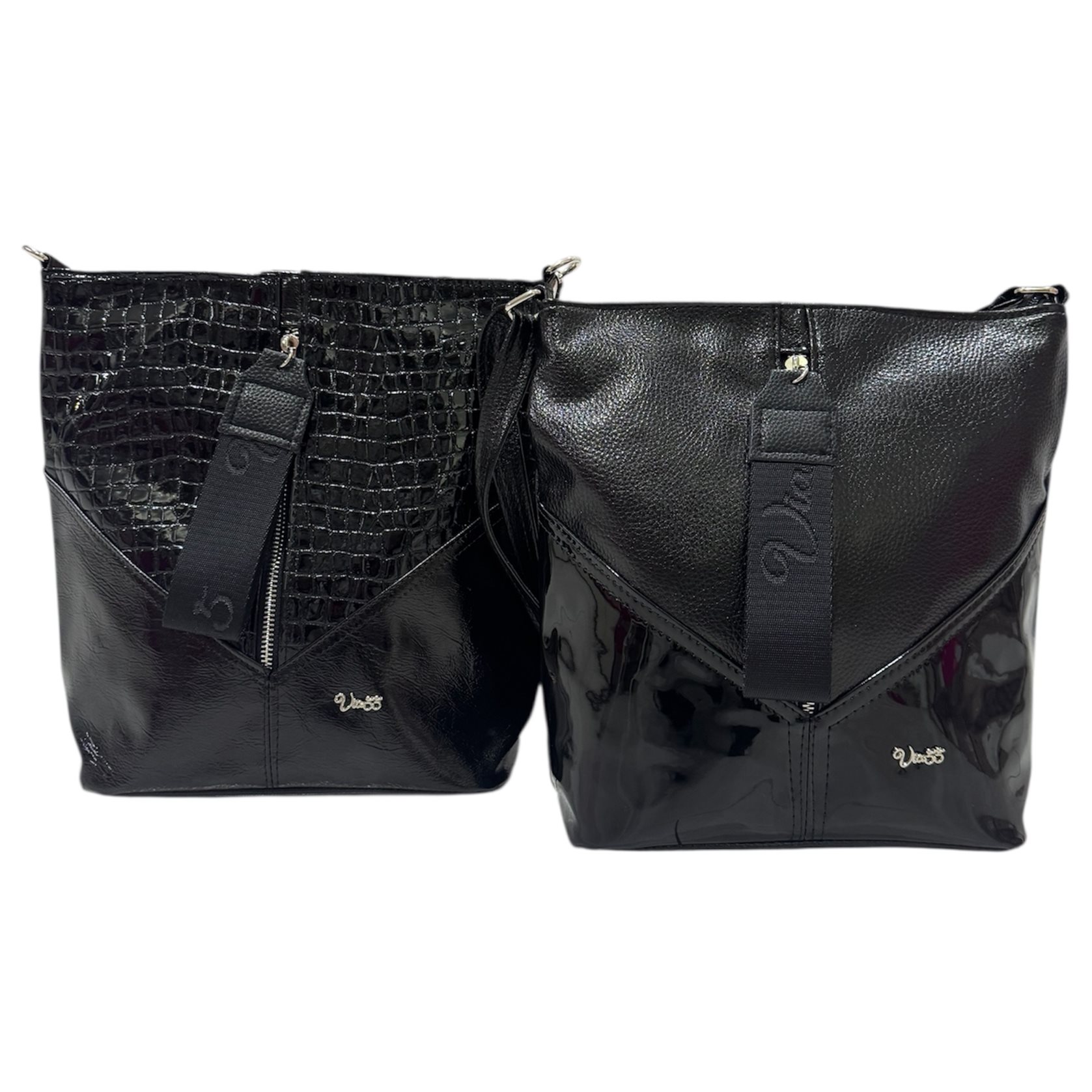 Divatos oldaltáska.Két rekeszes,elöl és hátul cipzáras zseb. Anyaga: rostbőr Származási hely: EU Szín: fekete,fekete-kroko. Méret: Szé 29 x Ma 28 x Mé 11,5 cm