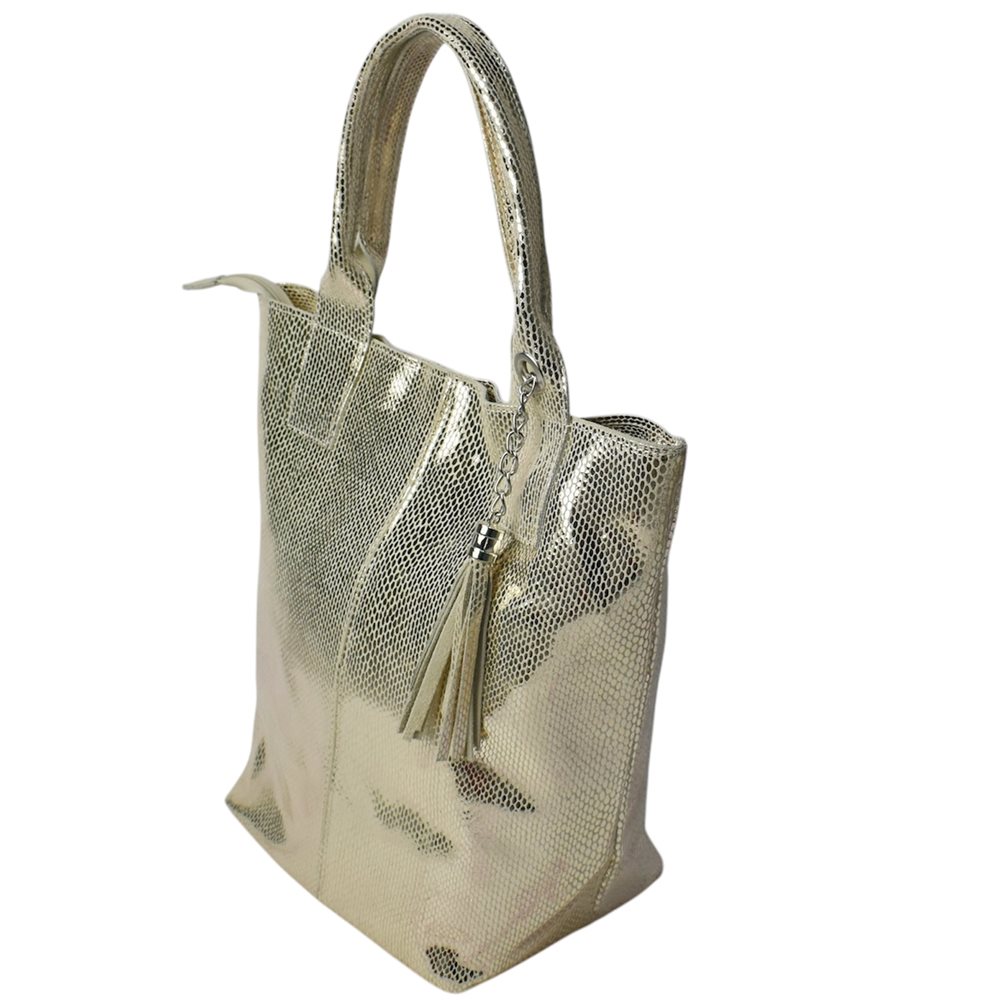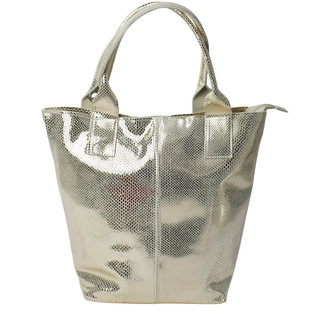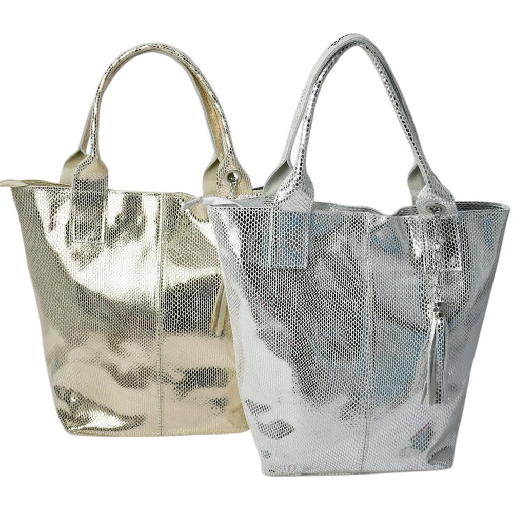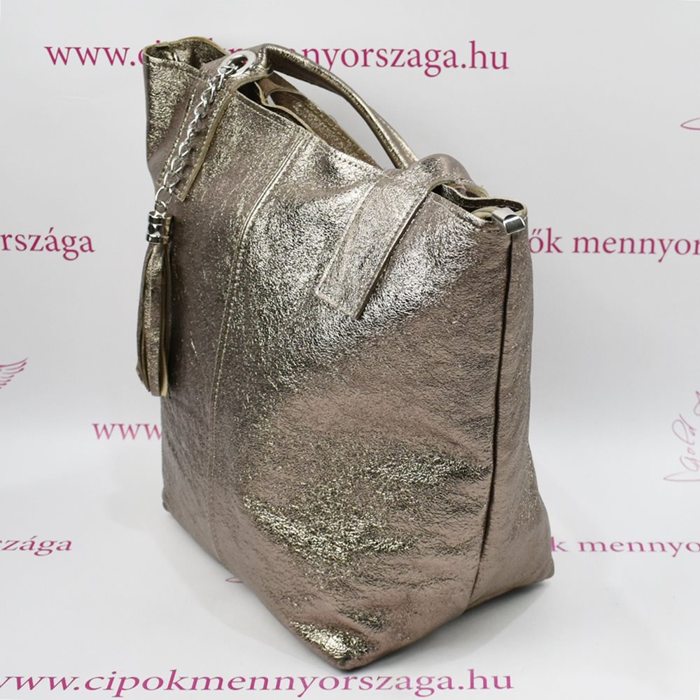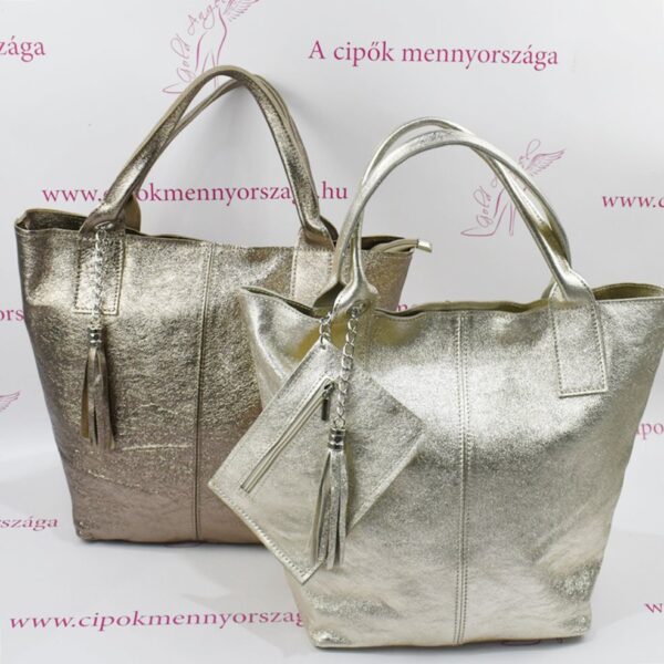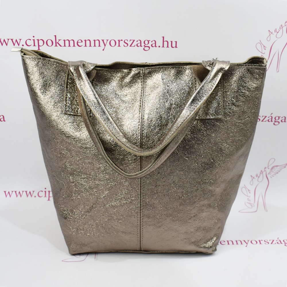 Elegáns divatos bőr válltáska,szatyor fazon. Egy rekeszes,belül cipzáras zseb. Anyaga: bőr Származási hely: EU Szín: ezüst,arany. Méret: szé 41 x ma 38 x mé 18 cm