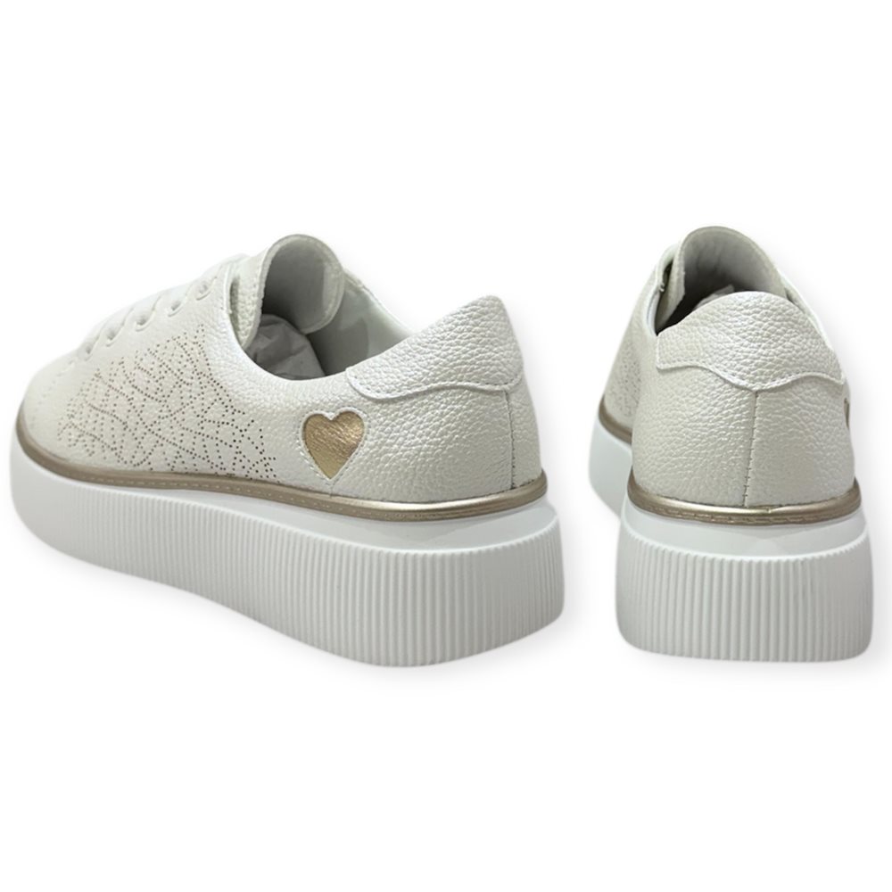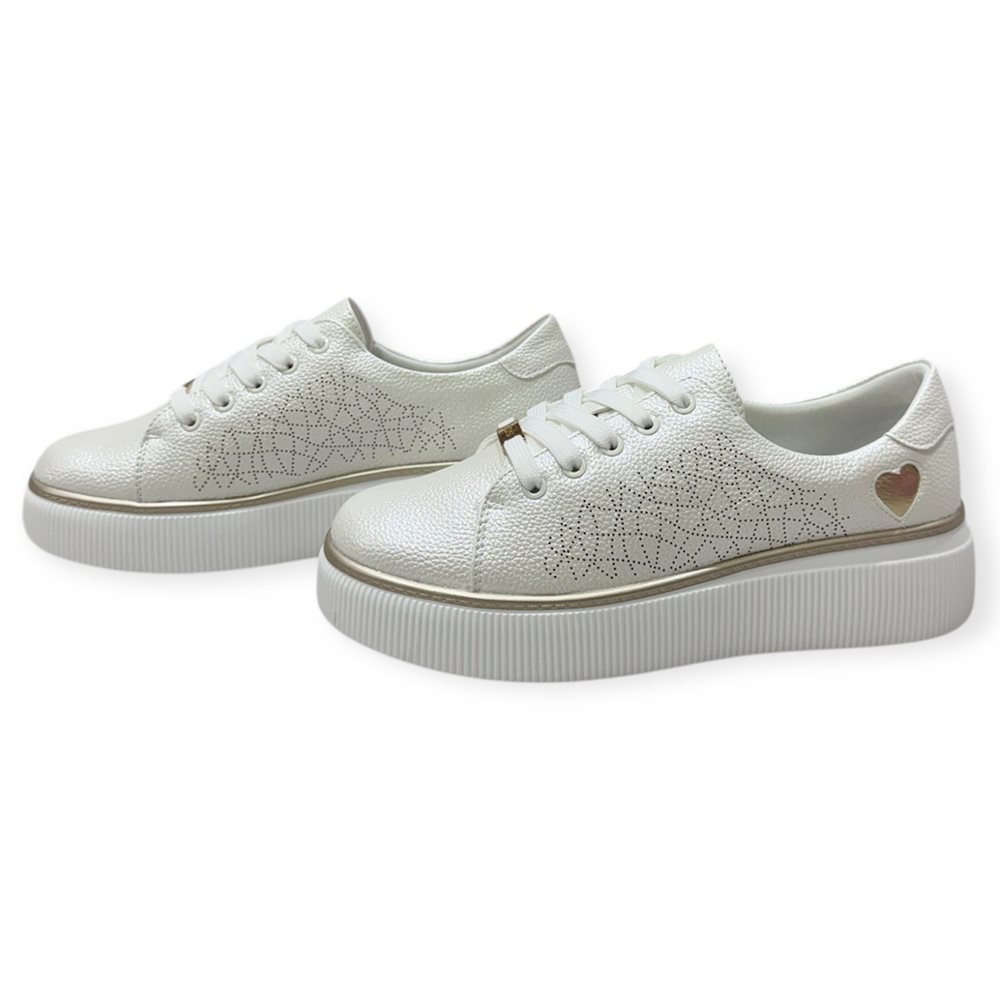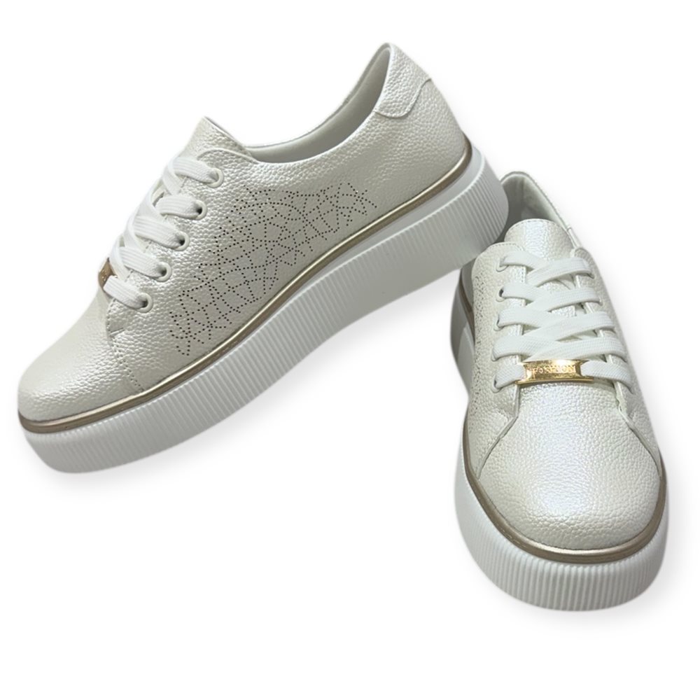 Divatos sneaker sportcipő. Anyaga: szintetikus. Származási hely: EU Szín: gyöngyház fehér Talp magasság: 3 cm Sarok magasság: 4,5 cm Méret: 36- 23 cm 37- 23,5 cm 38- 24 cm 39- 24,5 cm 40- 25 cm 41-25,5 cm