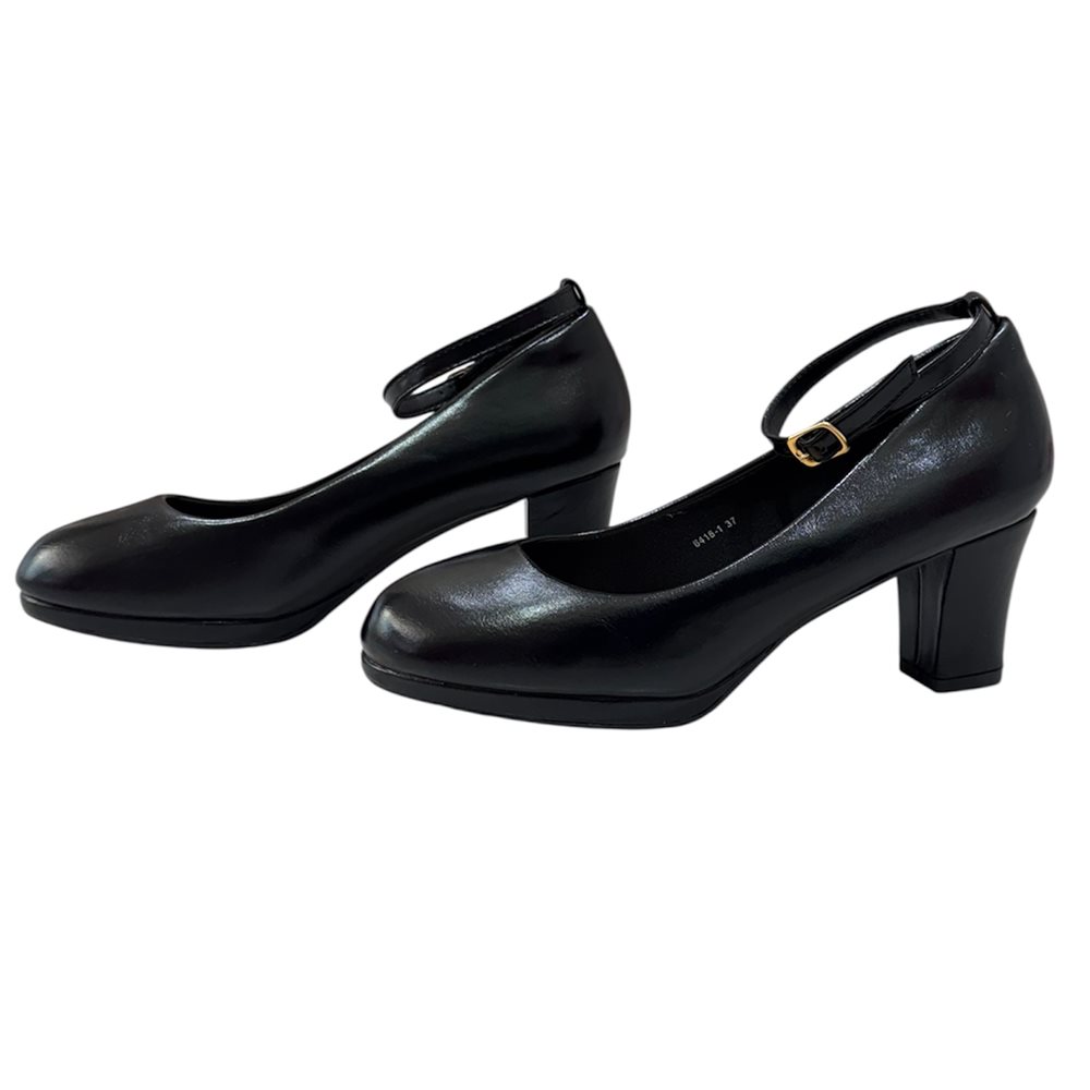 Kényelmes kocka sarkú cipő,bokapánttal. Anyaga: szintetikus Származási hely: EU Szín: fekete Sarok: 6,5 cm Méret:36- 23 cm 37- 24 cm 38- 24,5 cm 39- 25 cm 40- 25,5 cm