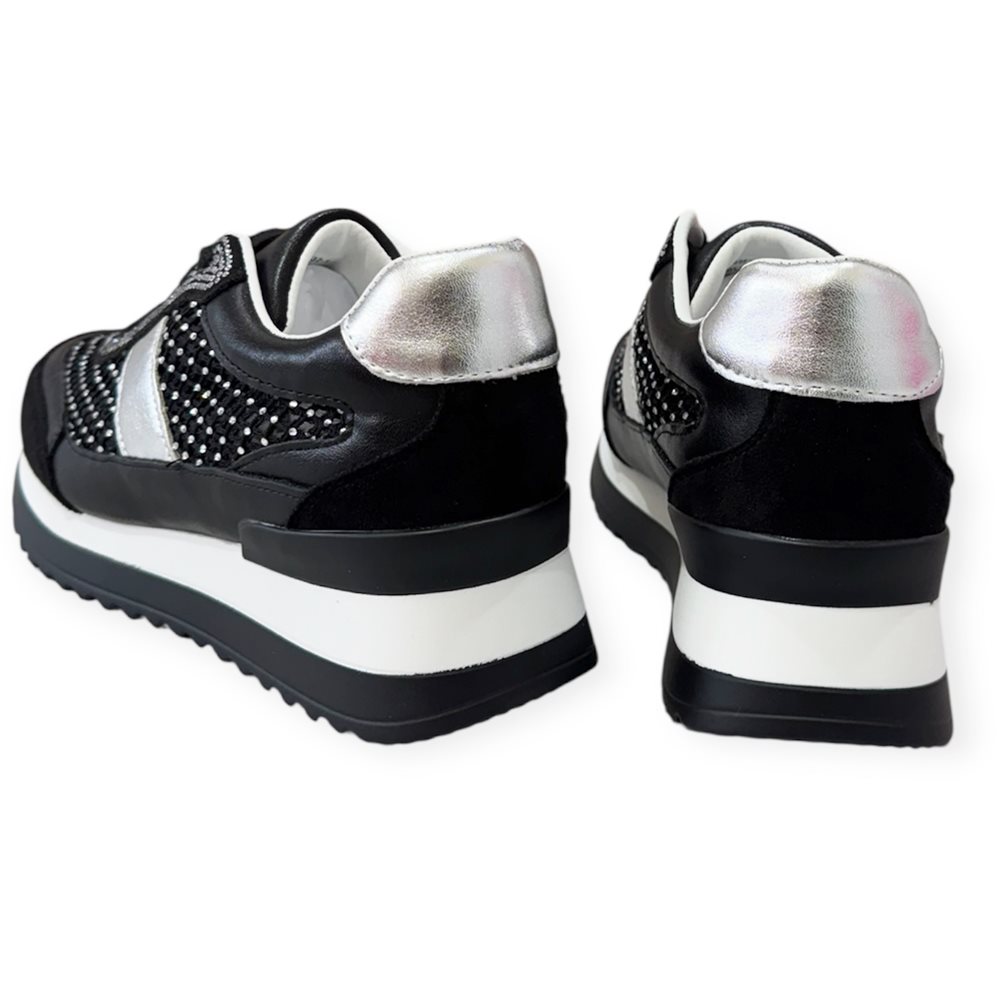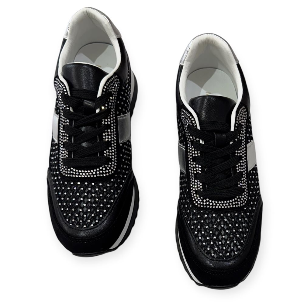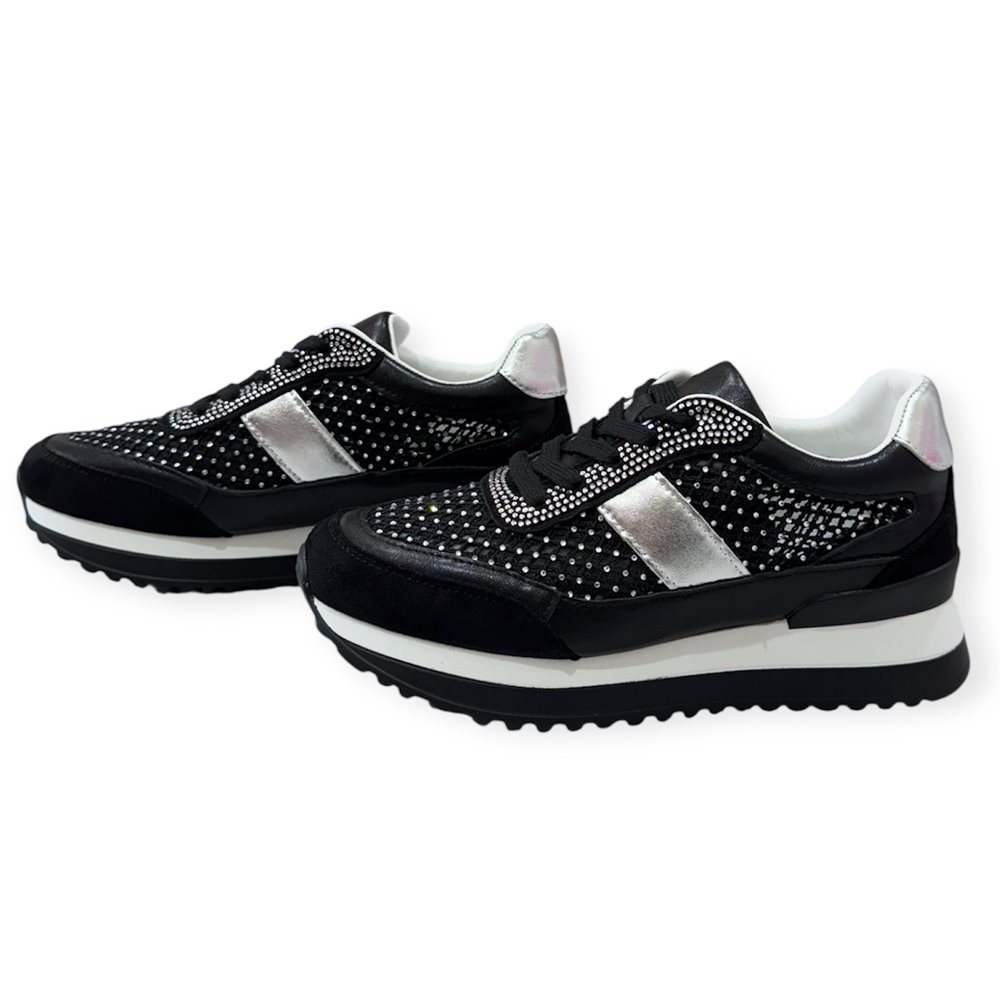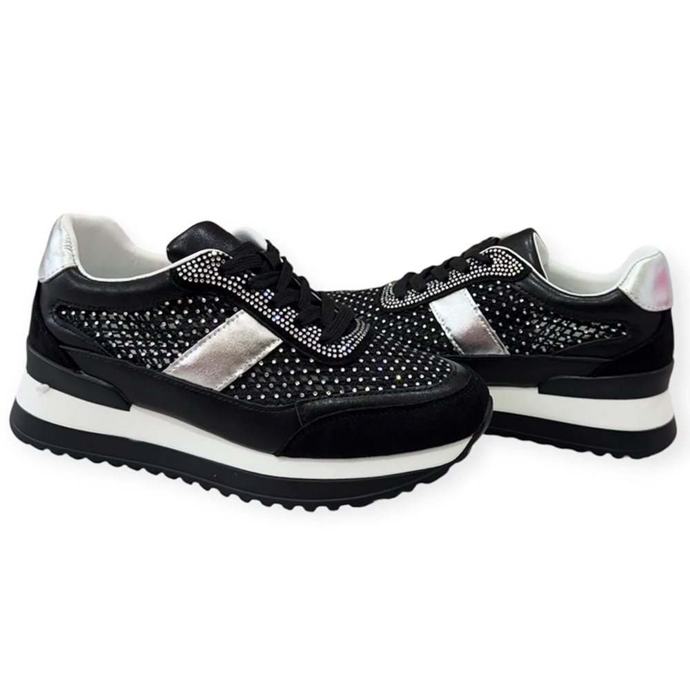 Divatos sneaker sportcipő,kövekkel díszítve. Anyaga: szintetikus. Származási hely: EU Szín: fekete-ezüst Talp magasság: 2,5 cm Sarok magasság: 4 cm Méret: 36- 23 cm 37- 23,5 cm 38- 24 cm 39- 24,5 cm 40- 25 cm 41-25,5 cm