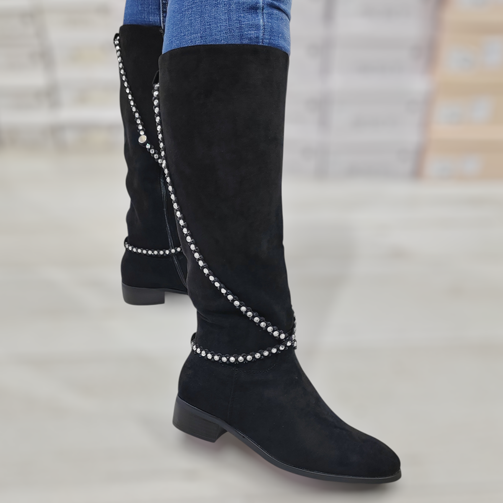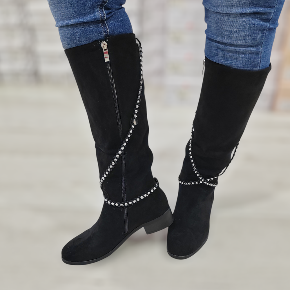 Divatos  köves csizma,oldalán cipzárral. Bélése: filc Anyaga: műbőr /nubuk/  Származási hely: EU Szín: fekete Sarok: 3,5 cm Talpvastagság: 0,5 cm Szárhossz saroktól mérve: 35 cm Méret: 36- 24 cm 37- 24,5 cm 38- 25 cm 39- 25,5 cm 40- 26 cm 41- 26,5