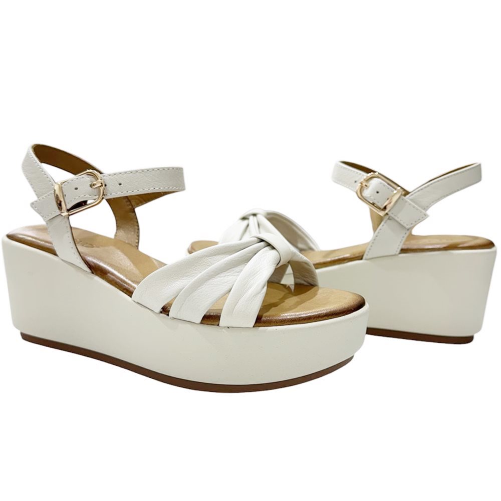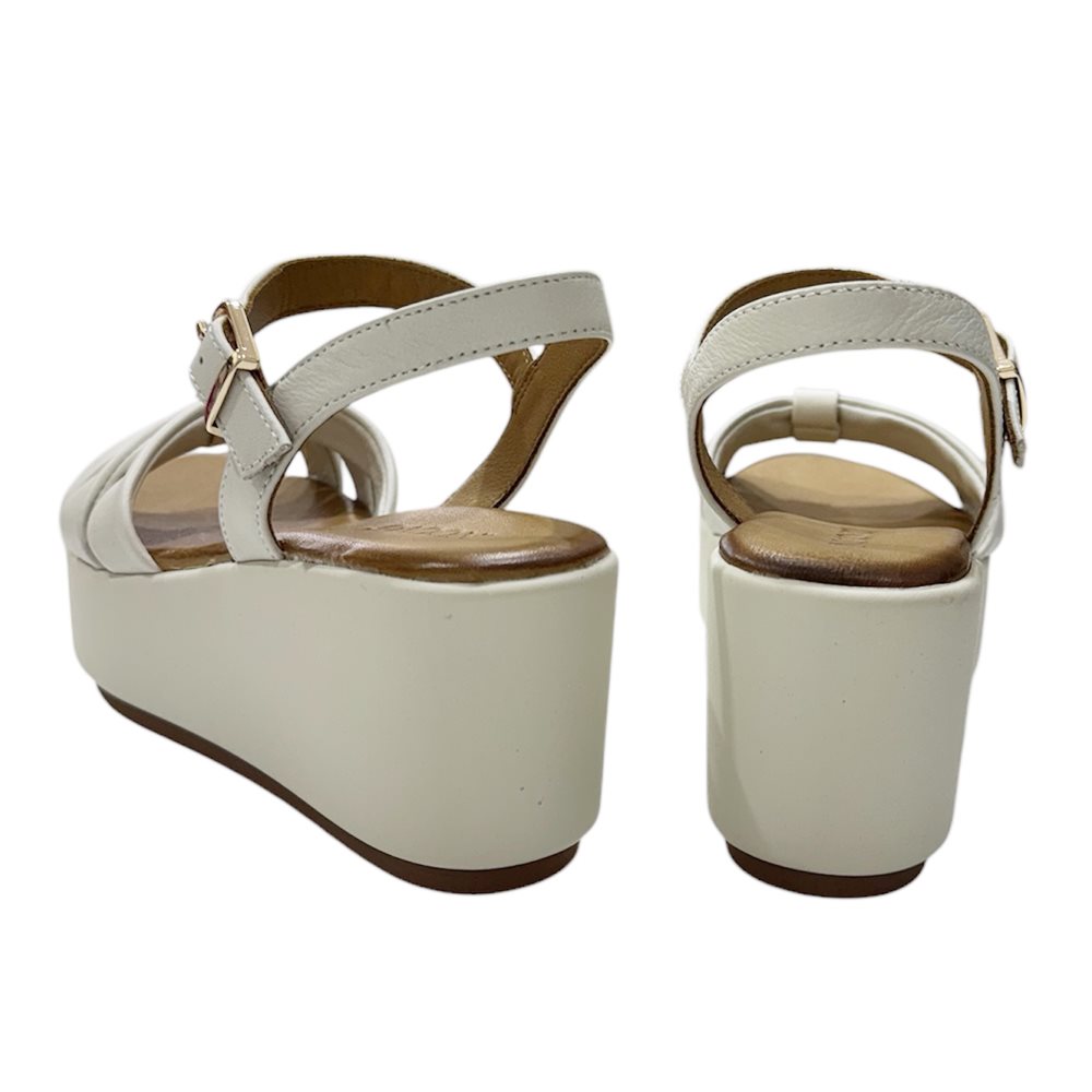 Divatos bőr emelt talpú szandál. Származási hely: EU Anyaga: bőr Szín: krém Talp vastagság: 4 cm Sarok magasság: 7 cm Méretek: 36- 23 cm 37- 23,5 cm 38- 24 cm 39- 24,5 cm 40- 25,5 cm 41- 26,5