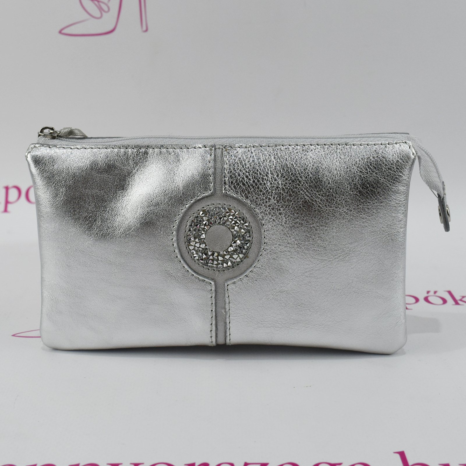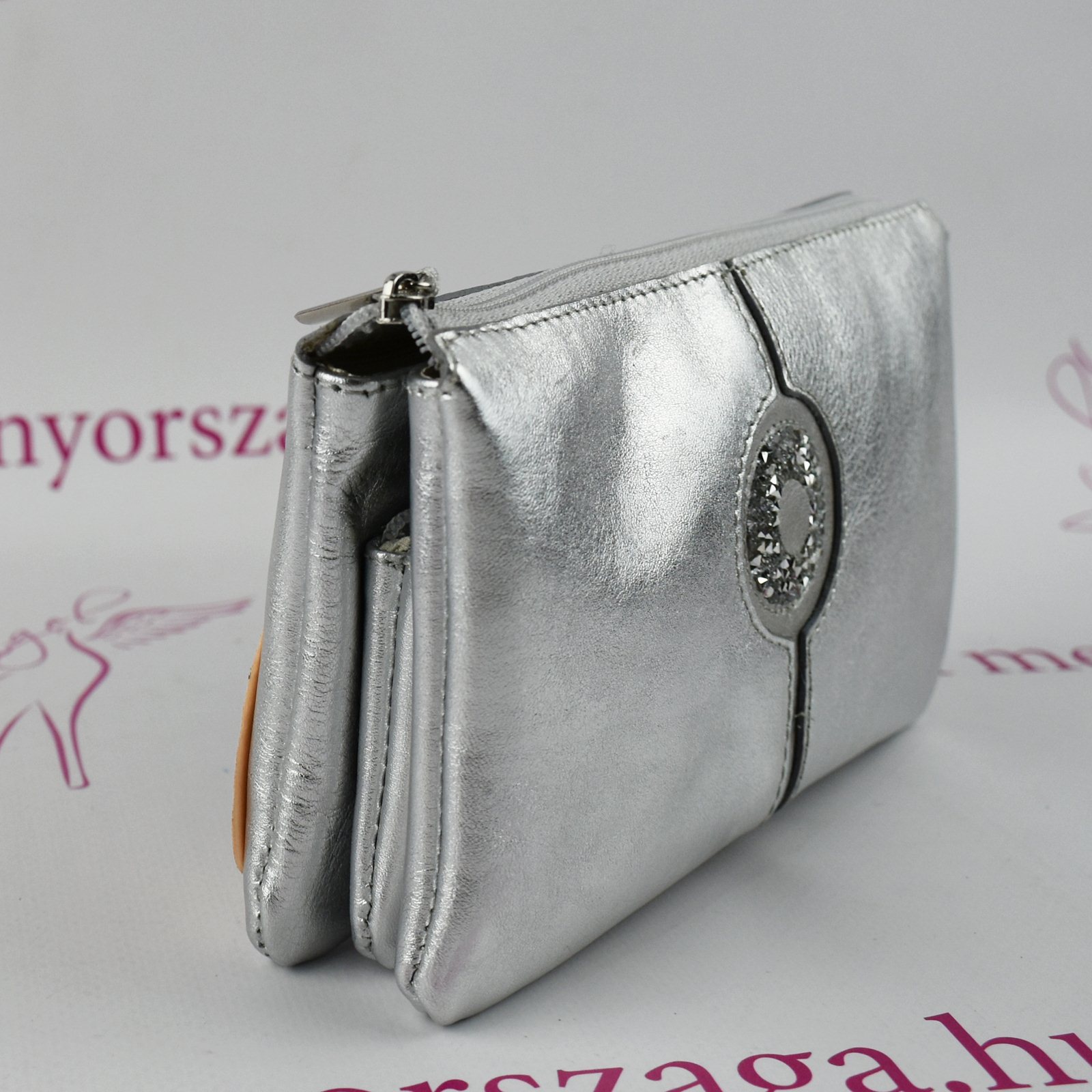 Valódi bőr pénztárca, swarovszky kövekkel díszítve. Anyaga: bőr Szín: ezüst  Méret: 18 x 11 x 3,5 cm Aprópénzes tartója cipzárral záródik,középen. A papírpénz kényelmesen belefér,2 külön rekeszben. Kártyáknak külön rekeszei vannak,legalább 7 db.