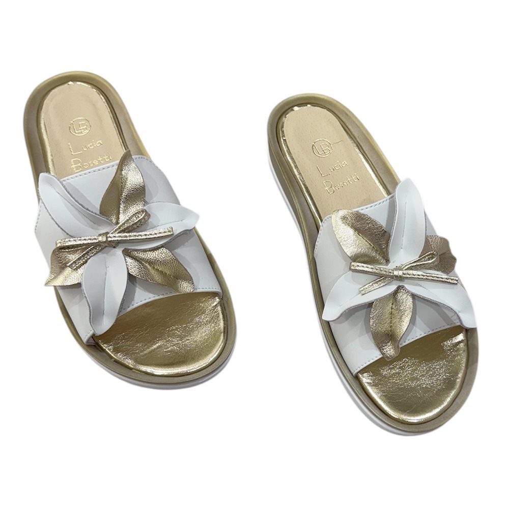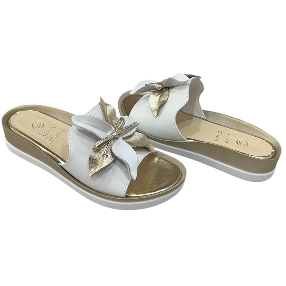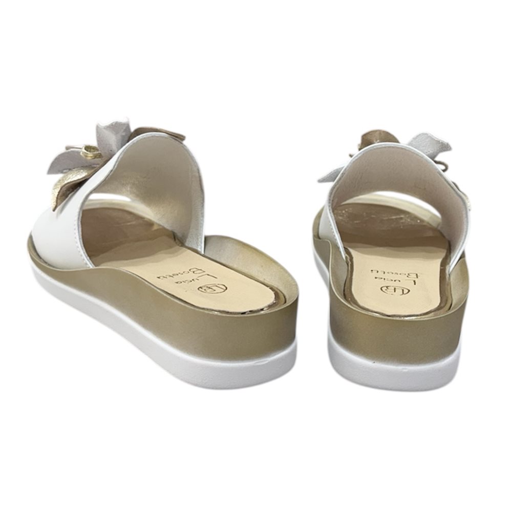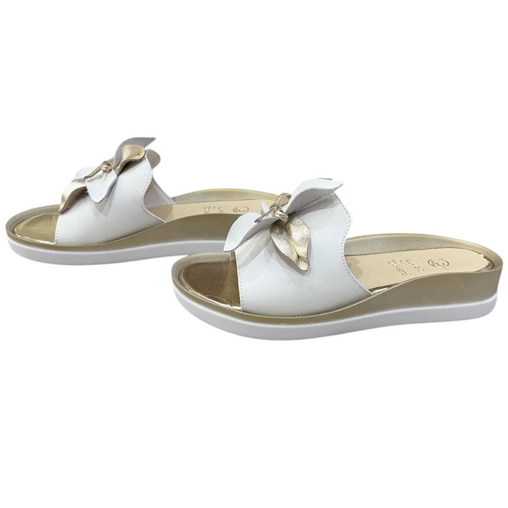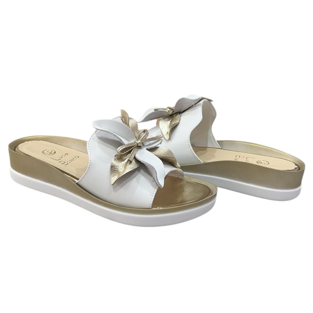 Divatos,elegáns bőr papucs. Származási hely: Lengyelország Anyaga: bőr Szín: fehér-arany Sarok rész: 4 cm Talp rész: 2 cm Méretek: 36- 22,5 cm 37- 23 cm 38- 23,5 cm 39- 24,5 cm 40- 25 cm