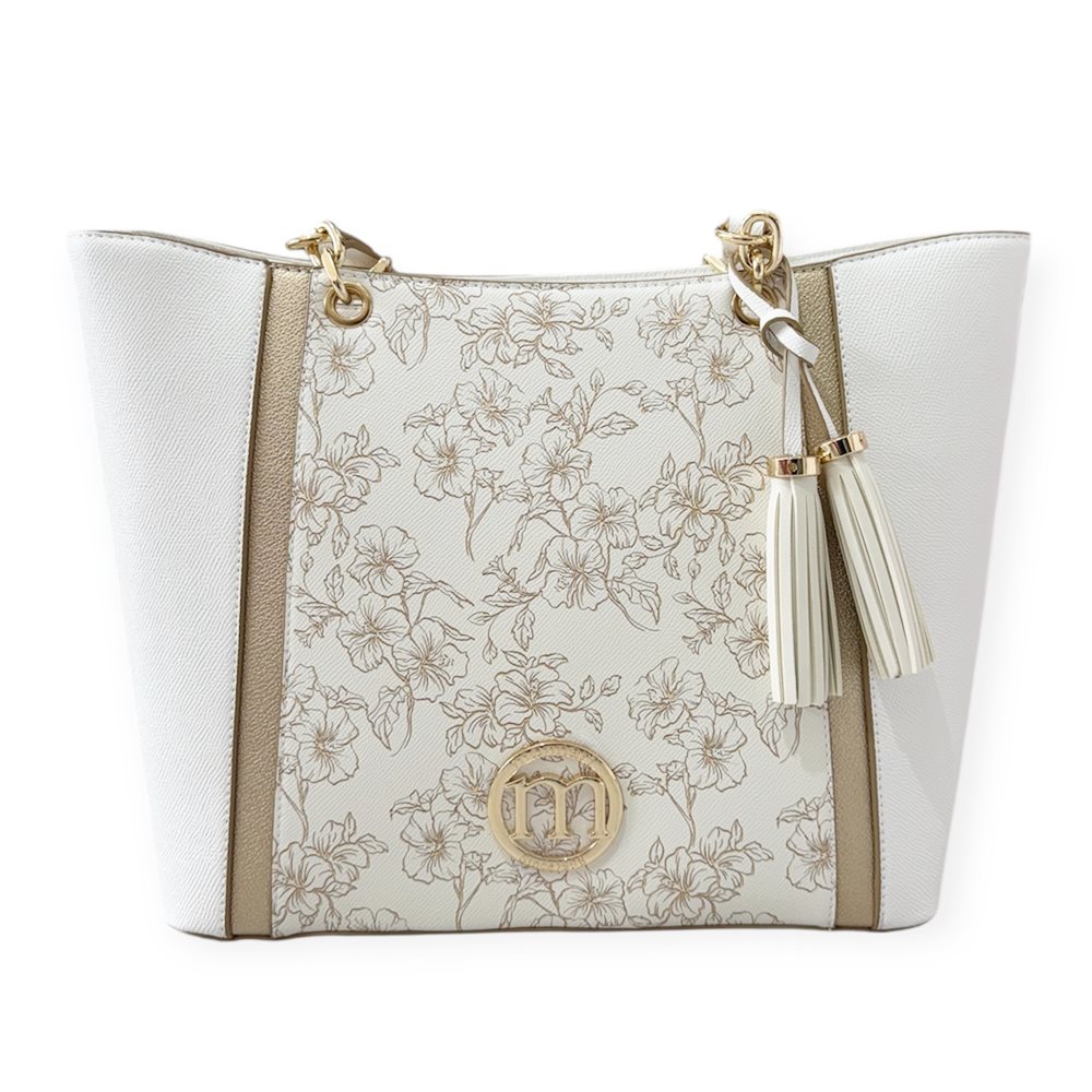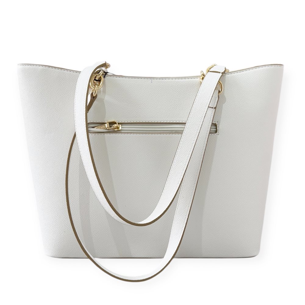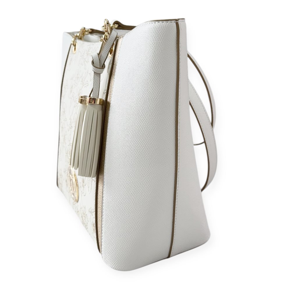 Divatos válltáska. Egy rekeszes,hátul cipzáras rekesz. Anyaga:  rostbőr Származási hely: EU Szín: fehér-bézs-arany. Méret: Szé 37,5 x Ma 26,5 x Mé 13,5 cm