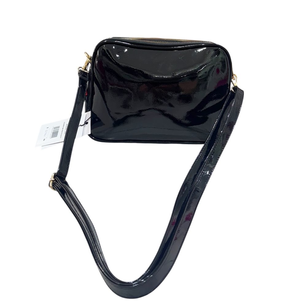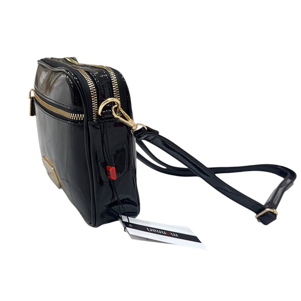 Divatos oldaltáska.Három rekeszes. Anyaga: szintetikus bőr Származási hely: EU Szín: fekete-lakk,fekete-matt. Méret: Szé 25 x Ma  18 x Mé 6 cm