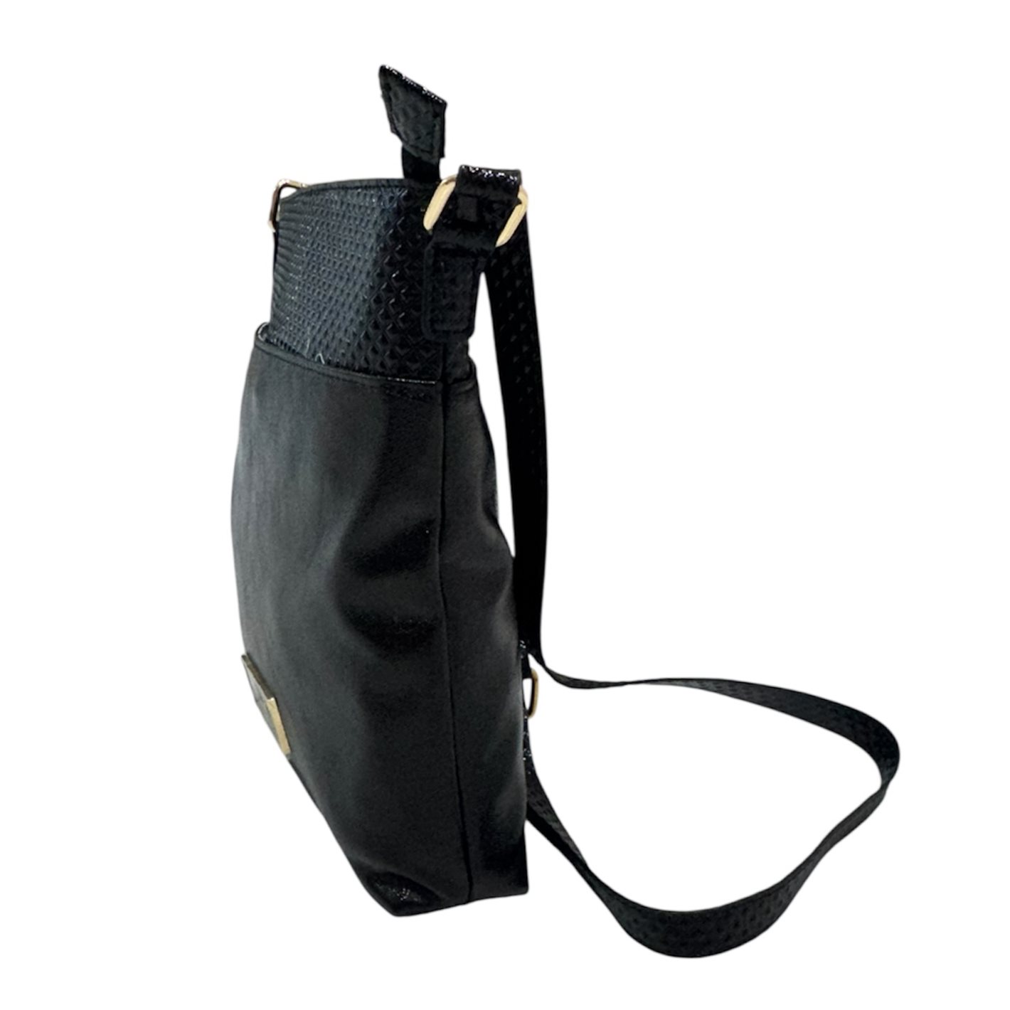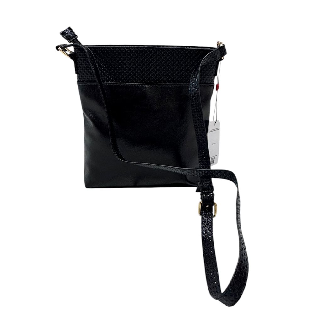 Divatos oldaltáska,állítható pánttal.Egy rekeszes,elöl és hátul patentos zseb. Anyaga: rostbőr Származási hely: EU Szín: fekete. Méret: Szé 24 x Ma 27 x Mé 5,5 cm