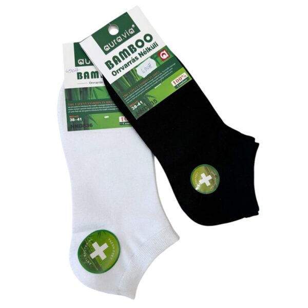 Bambusz pamut bokazokni,orrvarrás nélküli. Anyaga: 85%pamut, 10% poliamid, 5 % elastan Ápolás: Gépben mosható. Szín: Fekete,fehér Származási hely: EU
