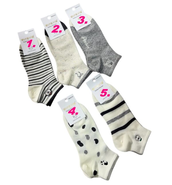 Női pamut bokazokni,orrvarrás nélküli. Anyaga: 85%pamut, 10% poliamid, 5 % elastan Ápolás: Gépben mosható. Szín: fehér-szürke-fekete Származási hely: EU