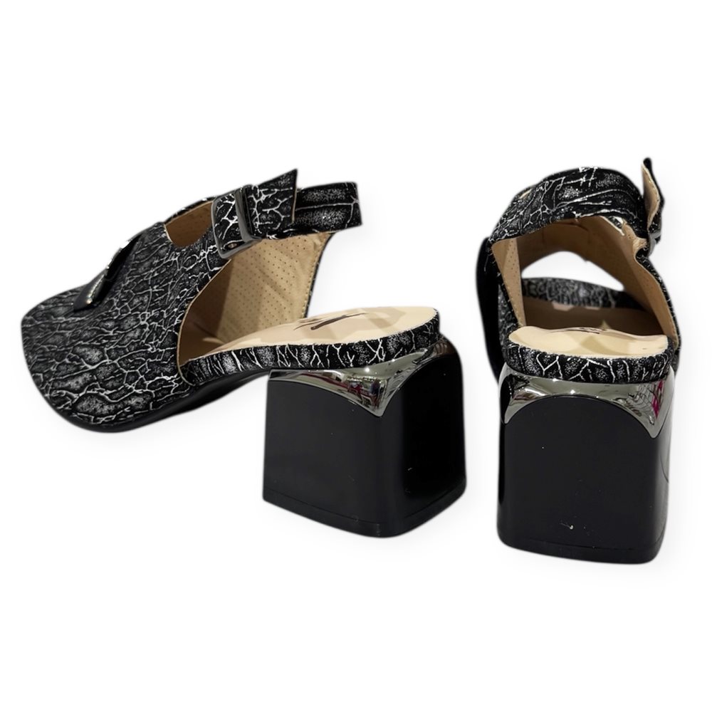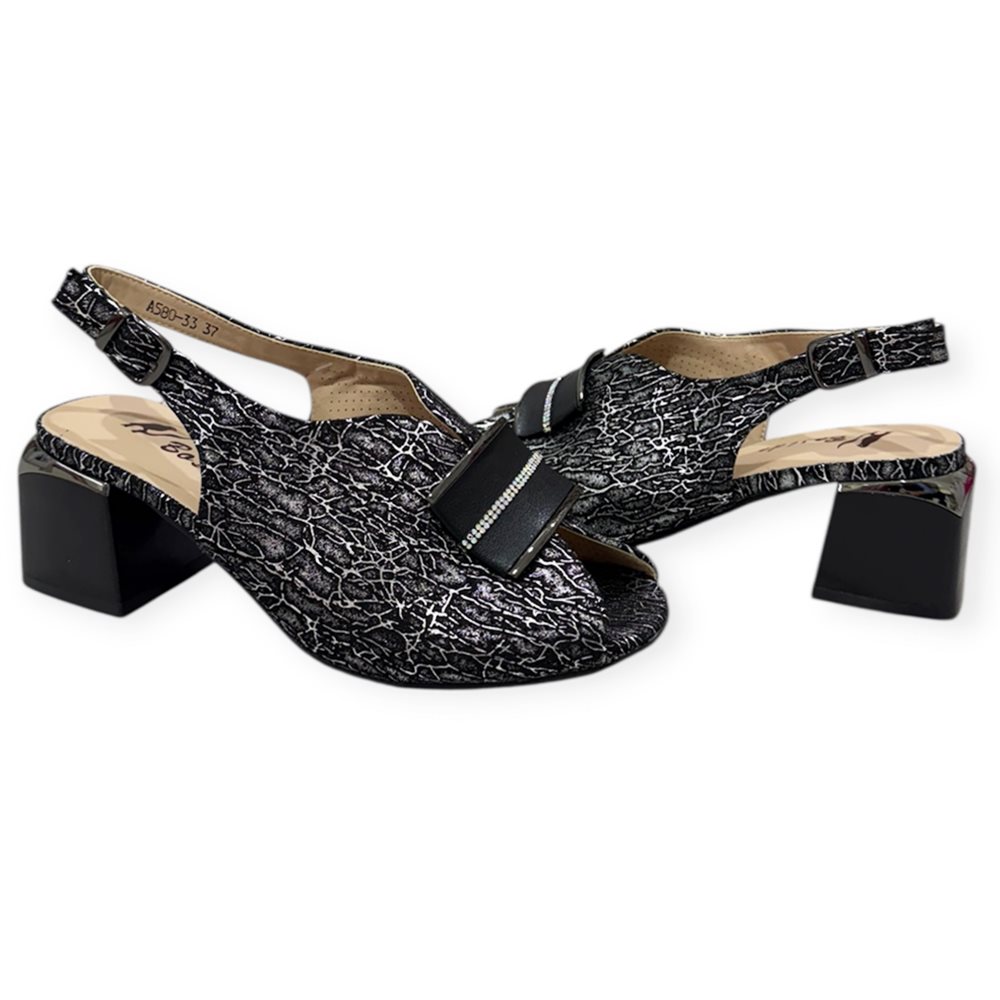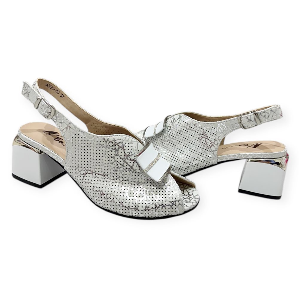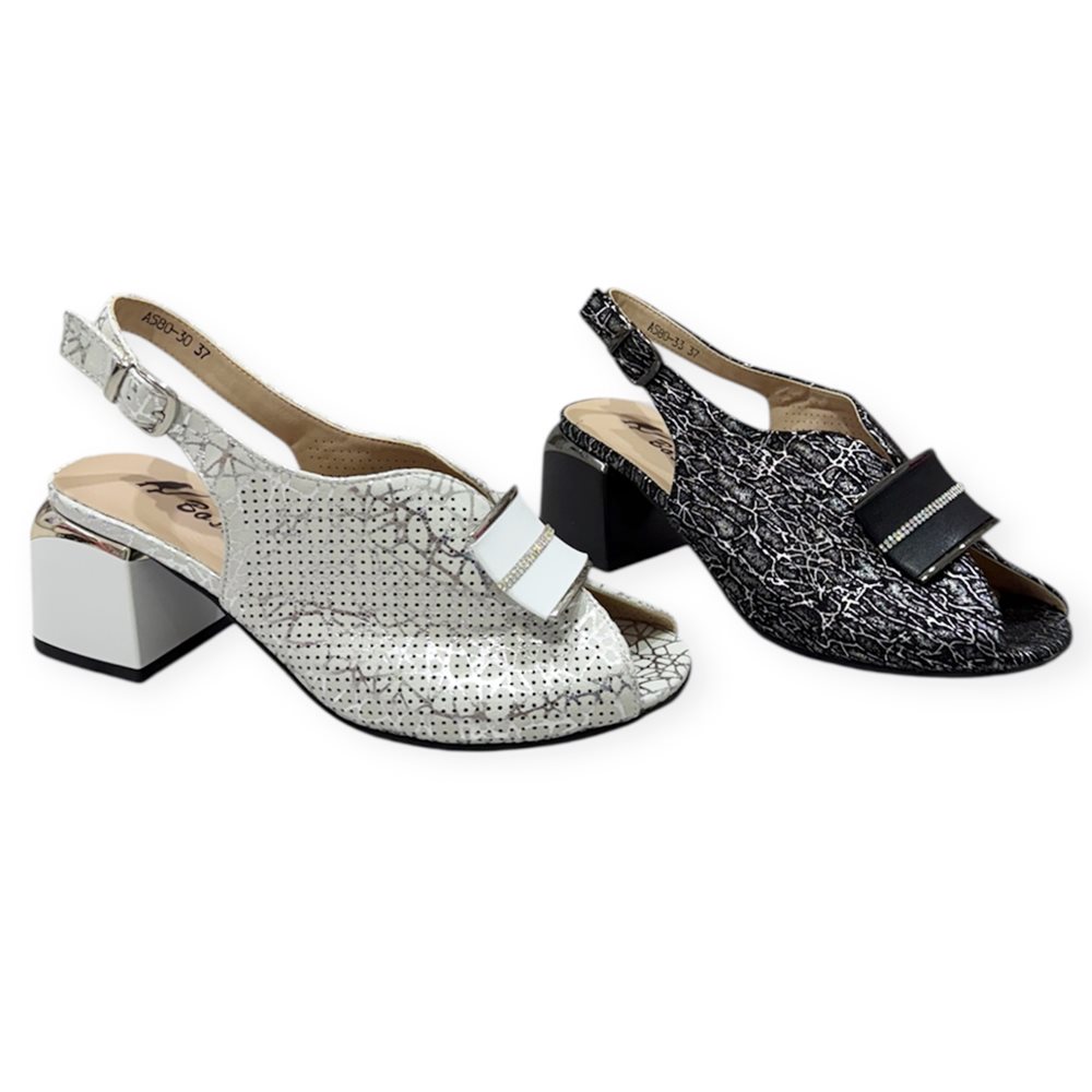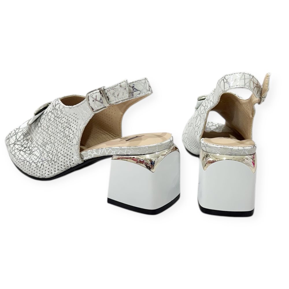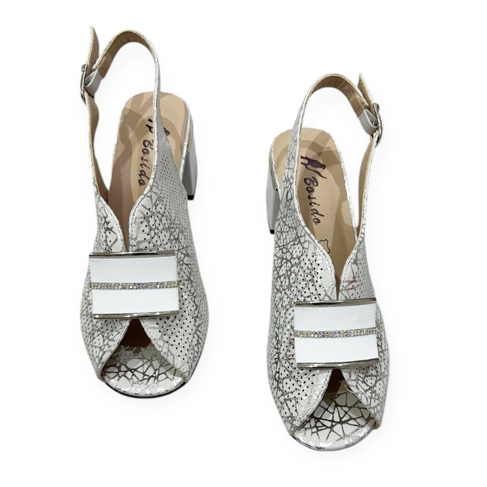 Elegáns kocka magassarkú nyitott orrésszel és dekoratív pánttal.Kényelmes, stabil sarokkal és légáteresztő, perforált felsőrésszel. Anyaga: szintetikus,belső talpa bőr. Származási hely: EU Szín: fehér-ezüst,fekete. Sarok magasság: 6,5 cm Méret: 36- 23 cm 37- 24 cm 38- 24,5 cm 39- 25,5 cm 40- 26 cm