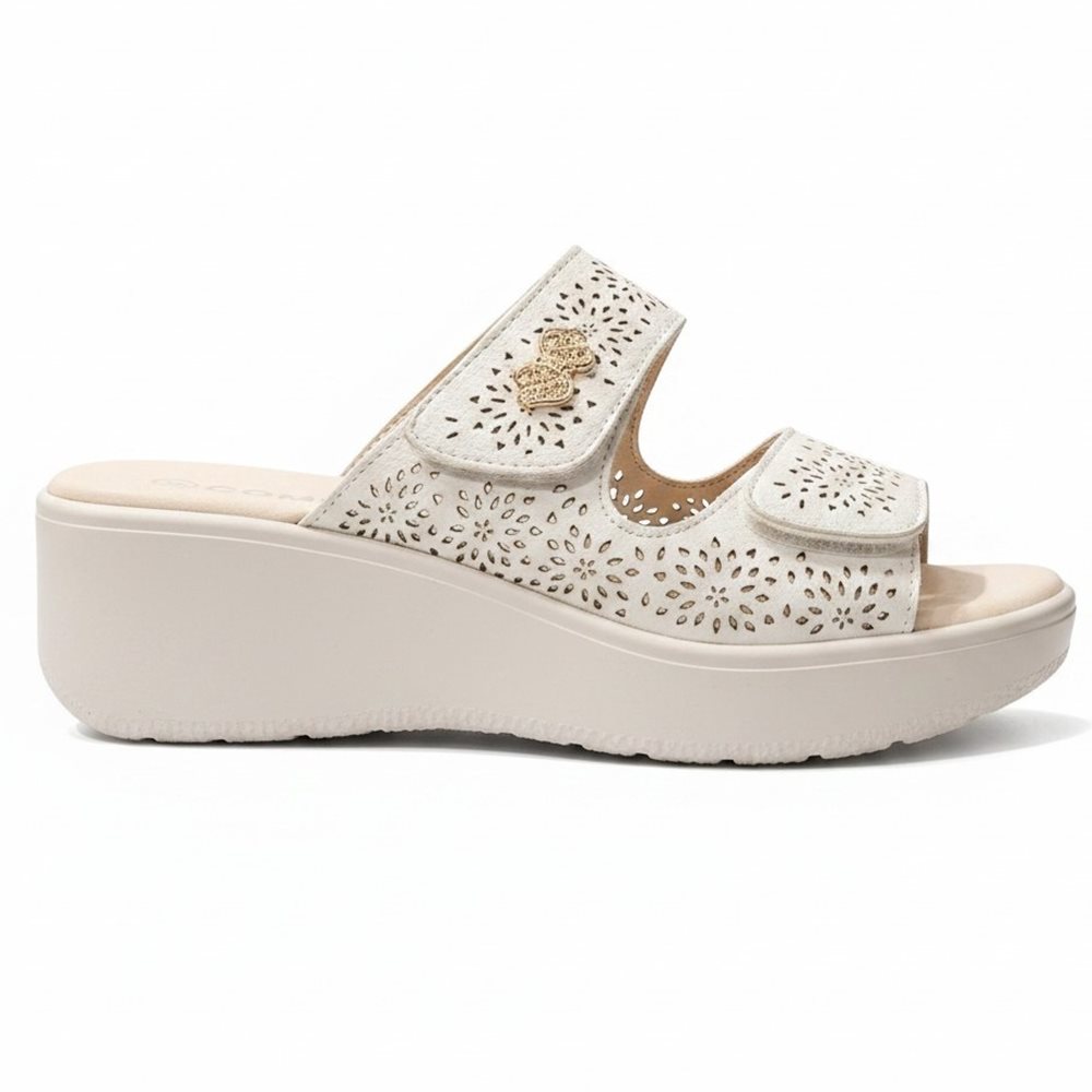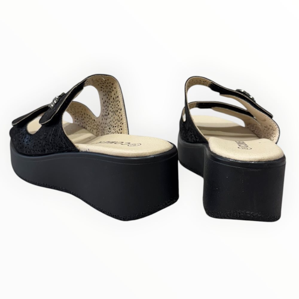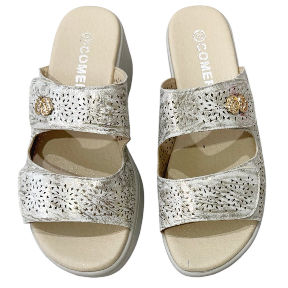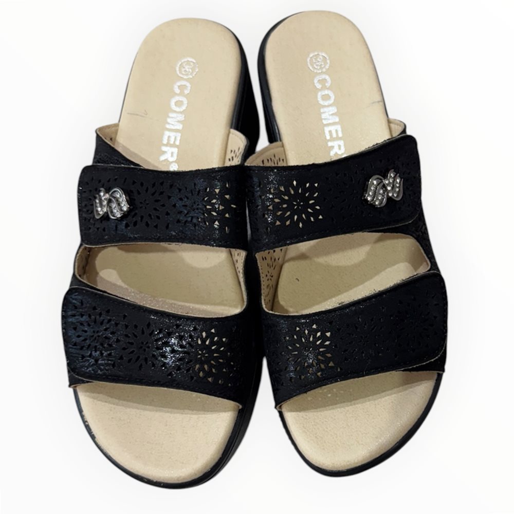 Könnyű,kényelmes  papucs,puha belső talppal és tépőzárral. Lézervágott díszítéssel.   Származási hely: EU Anyaga: szintetikus Szín: bézs-arany,fekete Talprész: 2,5  cm Sarok rész : 6 cm Méretek:  36- 23 cm 37- 23,5 cm 38- 24 cm 39- 24,5 cm 40- 25 cm 41- 26 cm