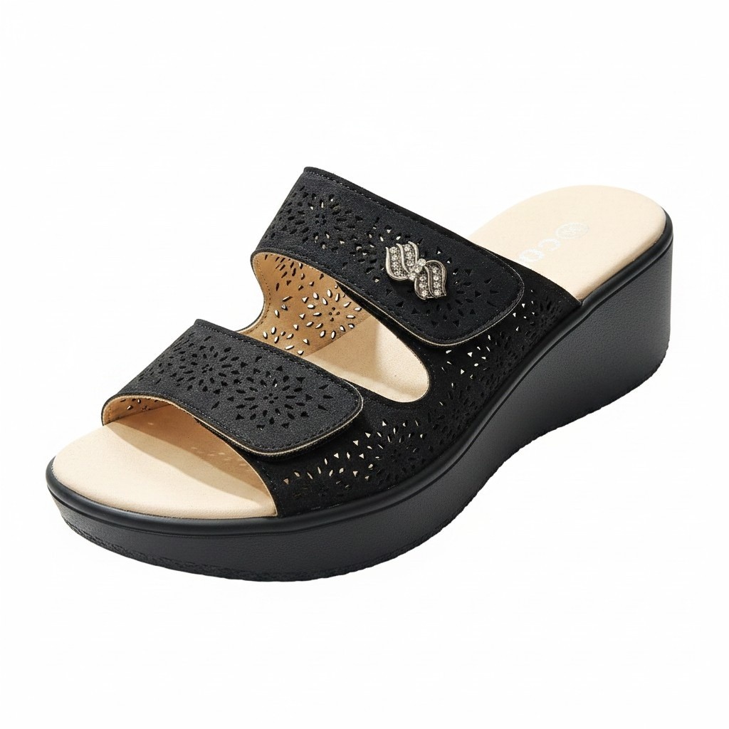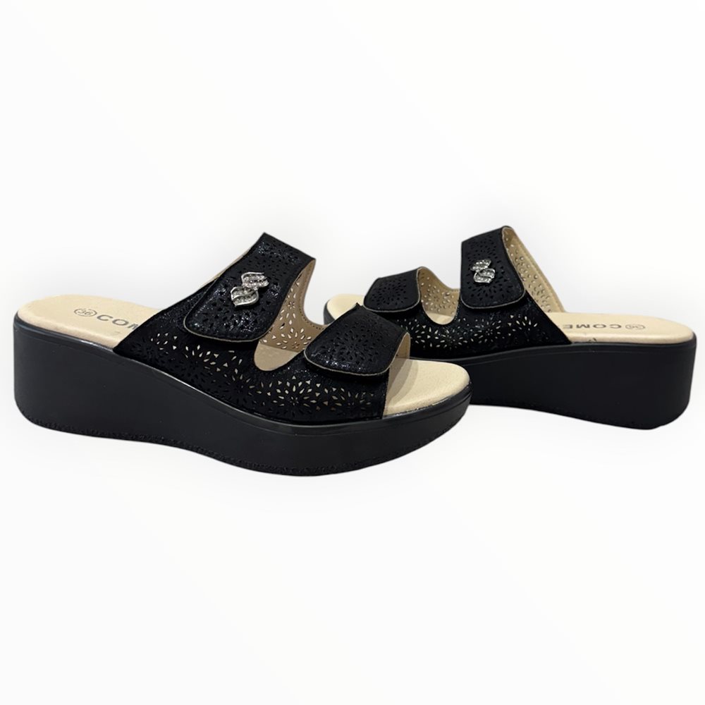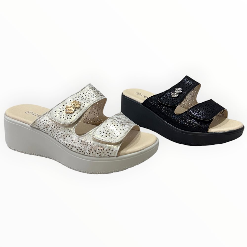 Könnyű,kényelmes  papucs,puha belső talppal és tépőzárral. Lézervágott díszítéssel.   Származási hely: EU Anyaga: szintetikus Szín: bézs-arany,fekete Talprész: 2,5  cm Sarok rész : 6 cm Méretek:  36- 23 cm 37- 23,5 cm 38- 24 cm 39- 24,5 cm 40- 25 cm 41- 26 cm