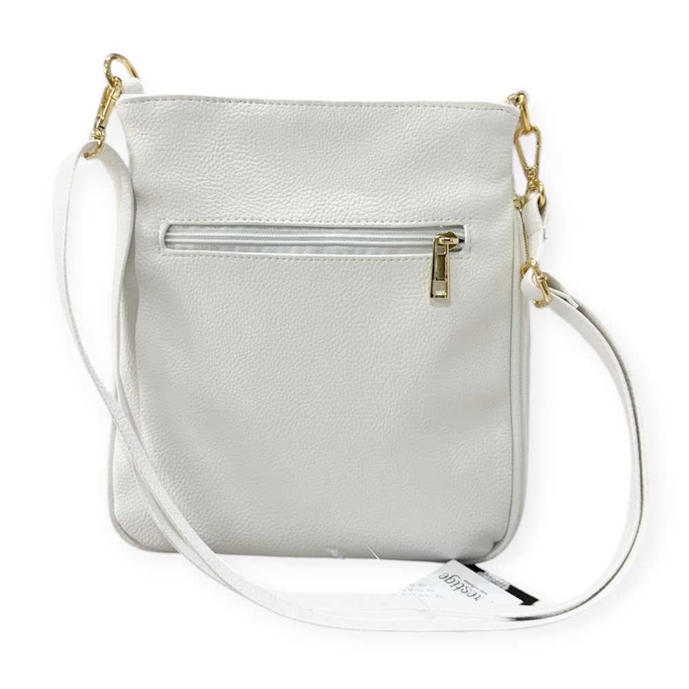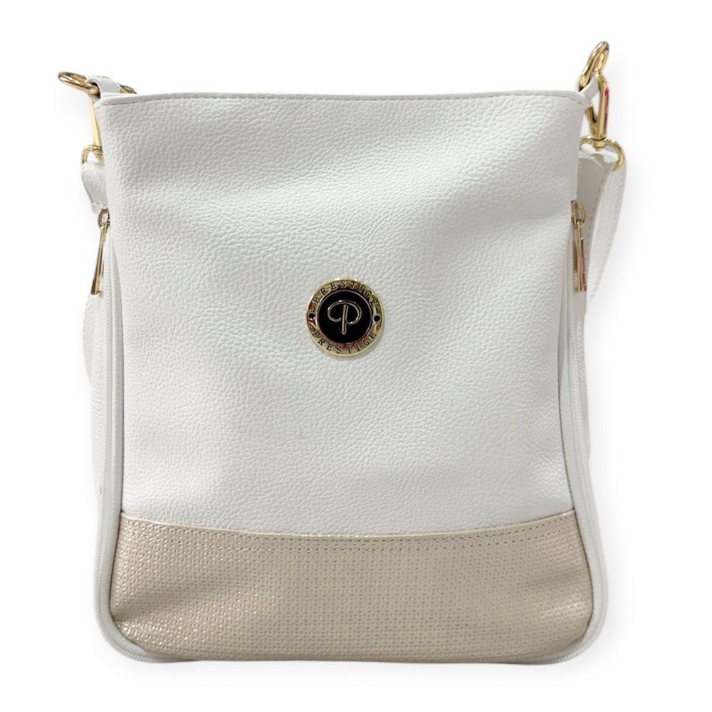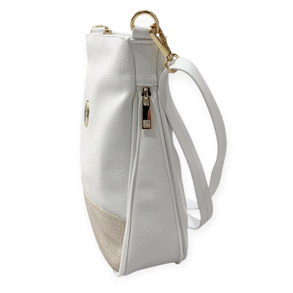 Divatos oldaltáska.Egy rekeszes.A mélysége bővíthető cipzár segítségével. Anyaga: rostbőr Származási hely: EU Szín: fehér-ekrü. Méret: Szé 25 x Ma 26,5 x Mé 2 cm (bővítve 6 cm)