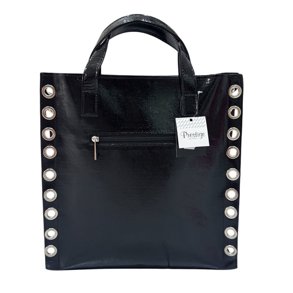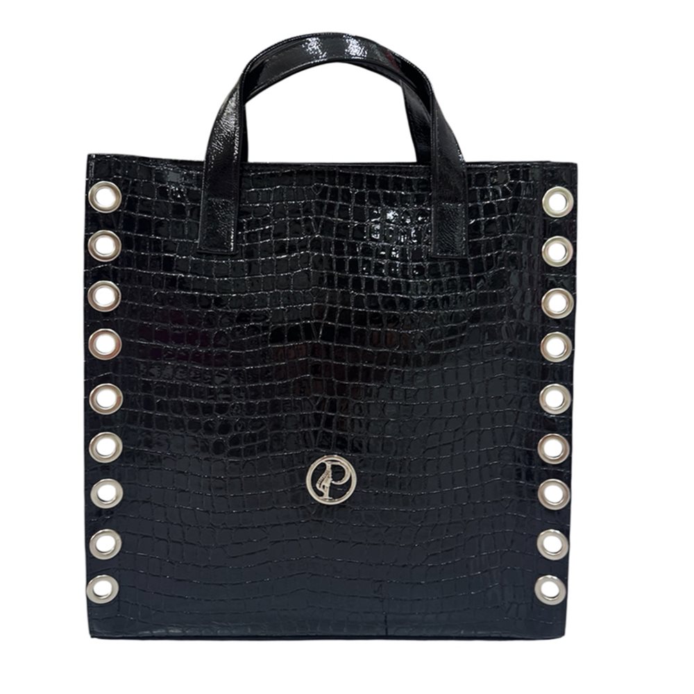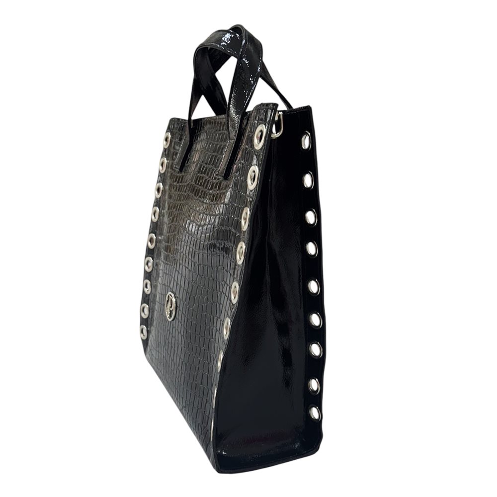 Divatos kézitáska. Két rekeszes.Plusz hosszú pánt. Anyaga: rostbőr Származási hely: Lengyelország Szín: fekete-kroko-lakk. Méret: Szé 35 x Ma 35,5 x Mé 13 cm