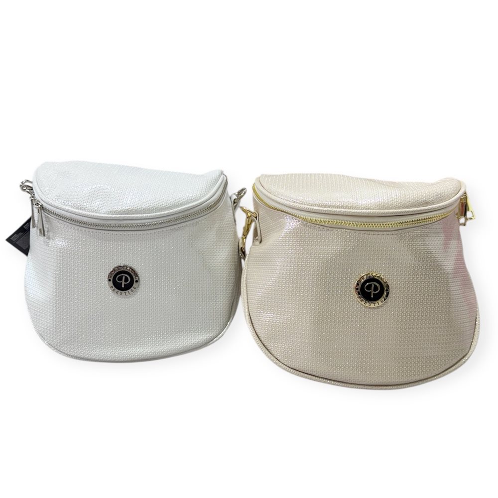 Divatos prestige kézi-oldaltáska.. Egy rekeszes,hátul cipzáras rekesz,plusz hosszú pánt Anyaga: rostbőr Származási hely: EU Szín: gyöngyház ekrü,ezüst Méret: Szé 23 x Ma 21 x Mé 12 cm
