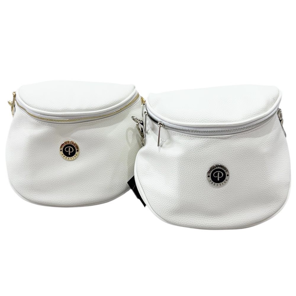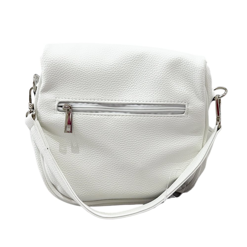 Divatos Prestige kézi-oldaltáska.. Egy rekeszes,hátul cipzáras rekesz,plusz hosszú pánt Anyaga: rostbőr Származási hely: EU Szín: fehér /arany logo/, fehér /ezüst logo/ Méret: Szé 23 x Ma 21 x Mé 12 cm