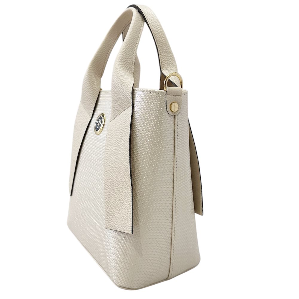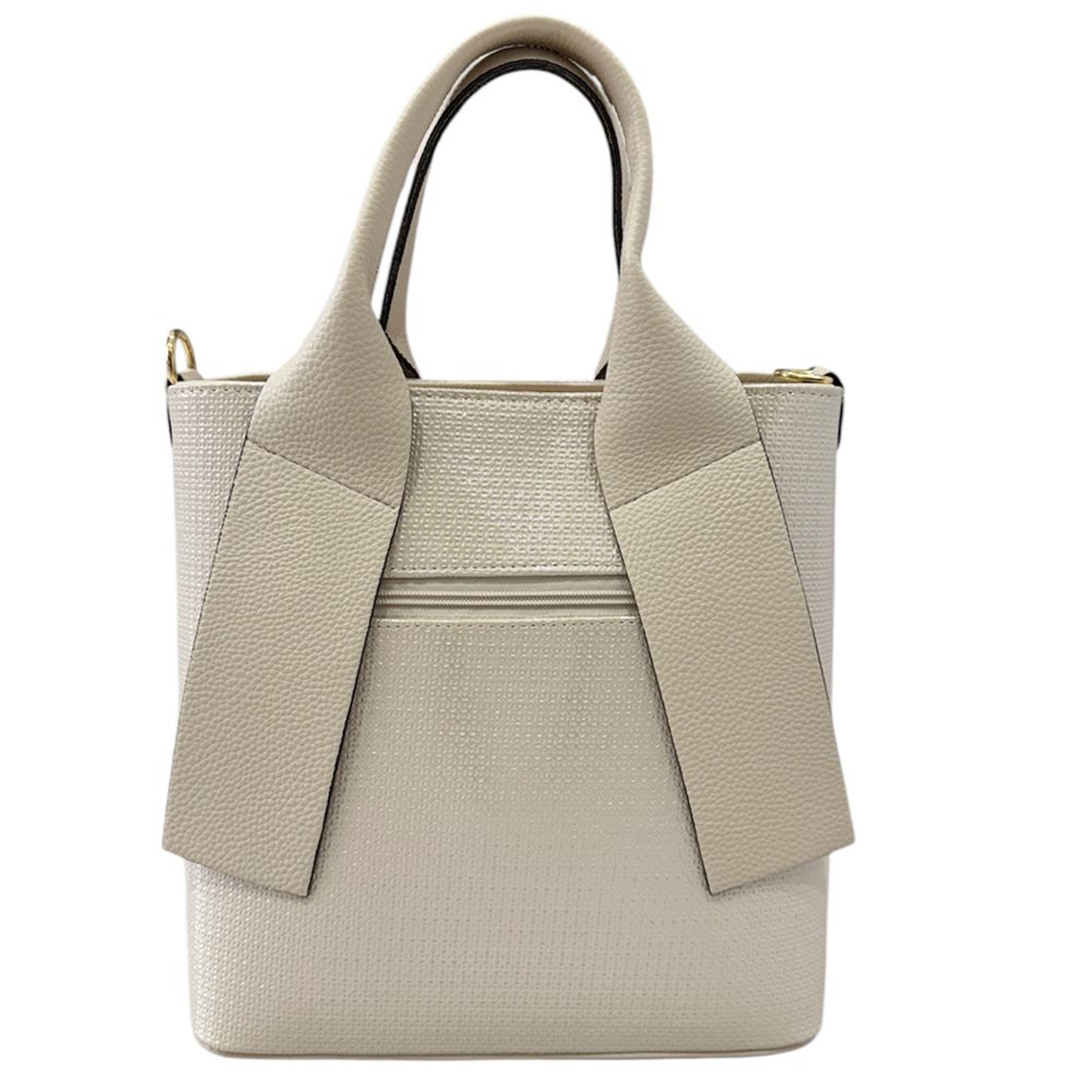 Elegáns és egyben hétköznapokra is alkalmas kézitáska. Egy rekeszes,belül cipzáras rekesz. Plusz hosszú pánt. Anyaga: rostbőr Származási hely: Lengyelország Szín: ezüst,gyöngyház-ekrü. Méret: Szé 26 x Ma 27 x Mé 14 cm