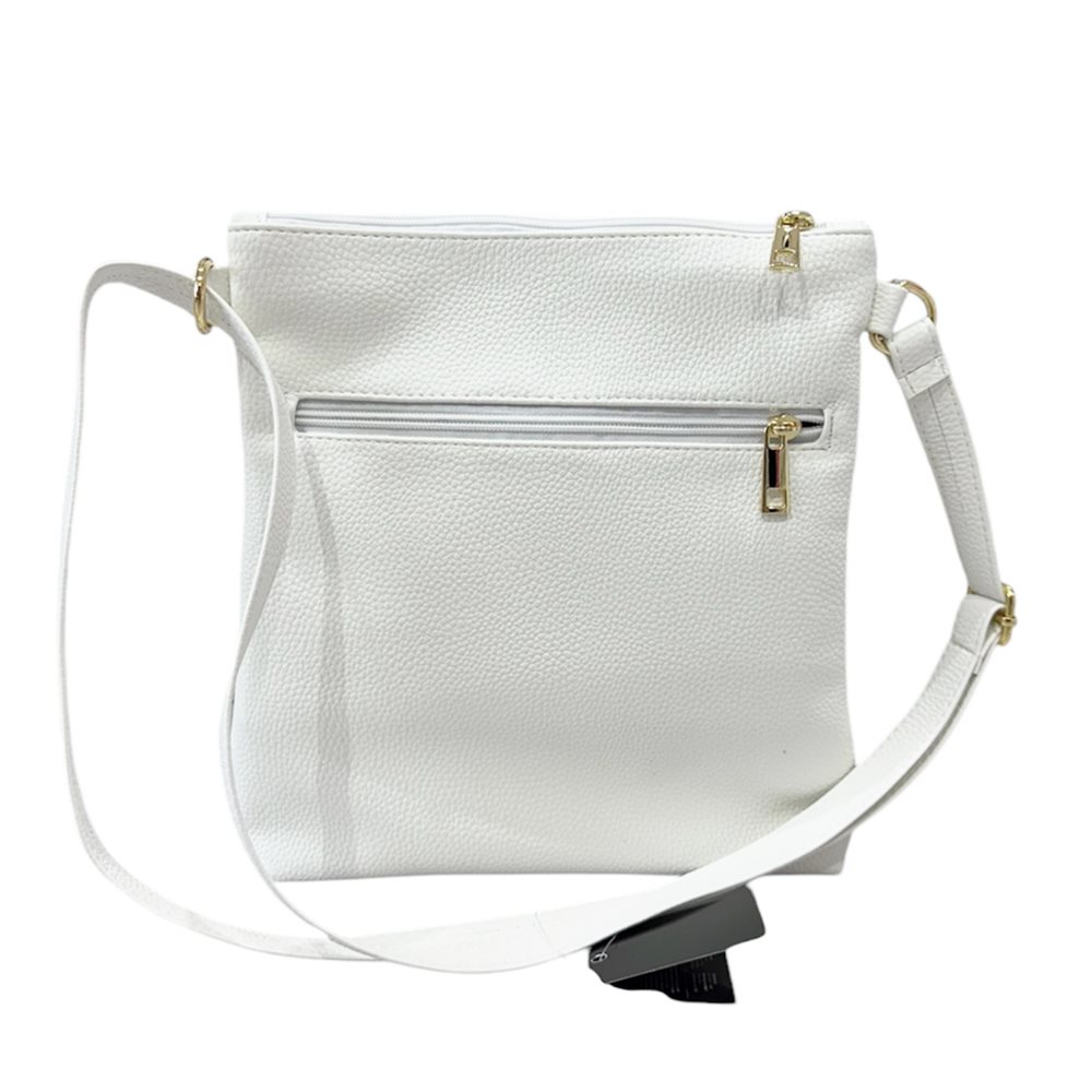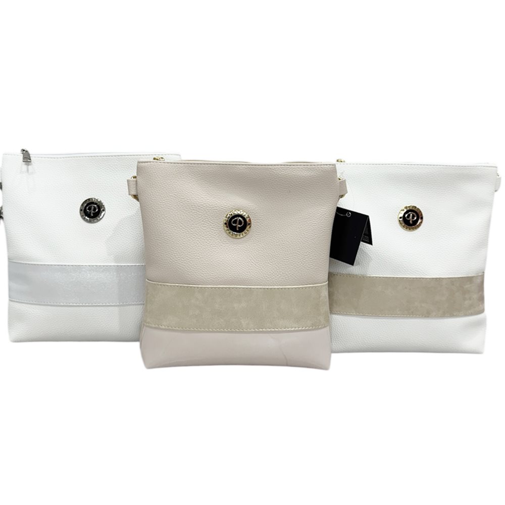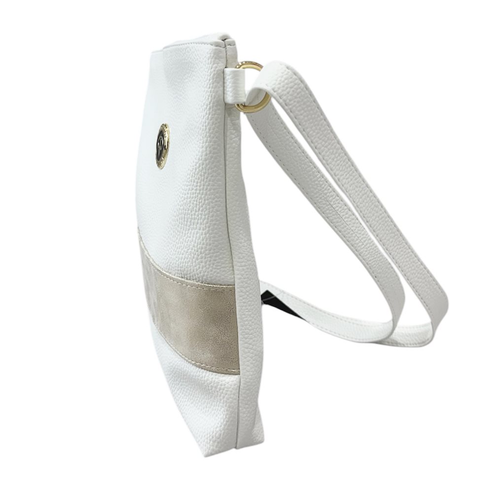 Divatos oldaltáska,állítható pánttal.Egy rekeszes,hátul cipzáras rekesz. Anyaga: rostbőr Származási hely: EU Szín: fehér-ezüst,fehér-arany,krém-arany. Méret: Szé 24,5 x Ma 27 x Mé 24 cm