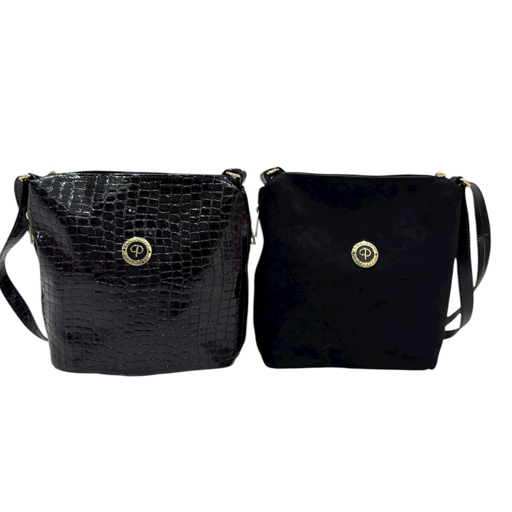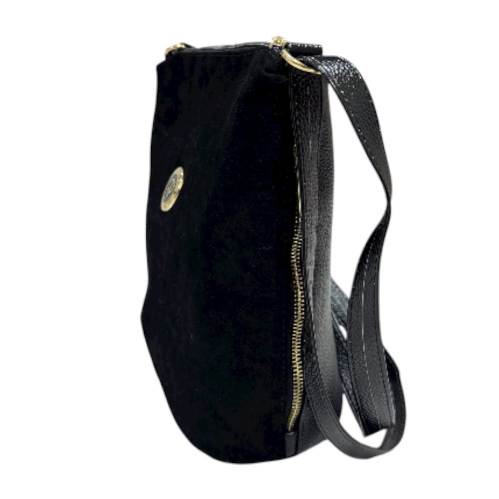 Divatos oldaltáska.Egy rekeszes,két oldalt cipzáras rekesz. Anyaga: rostbőr Származási hely: EU Szín: fekete-kroko,fekete (nubuk) Méret: Szé 26 x Ma 26 x Mé 13 cm
