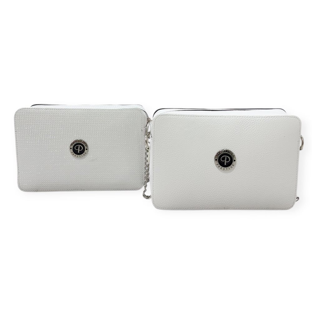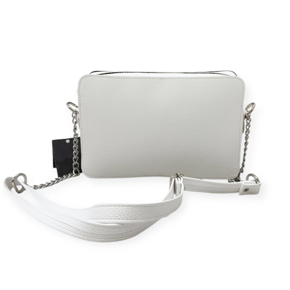 Divatos oldaltáska,állítható pánttal.Egy rekeszes. Anyaga: rostbőr Származási hely: EU Szín: ezüst,fehér /ezüst logo/. Méret: Szé 24 x Ma 16,5 x Mé 6 cm