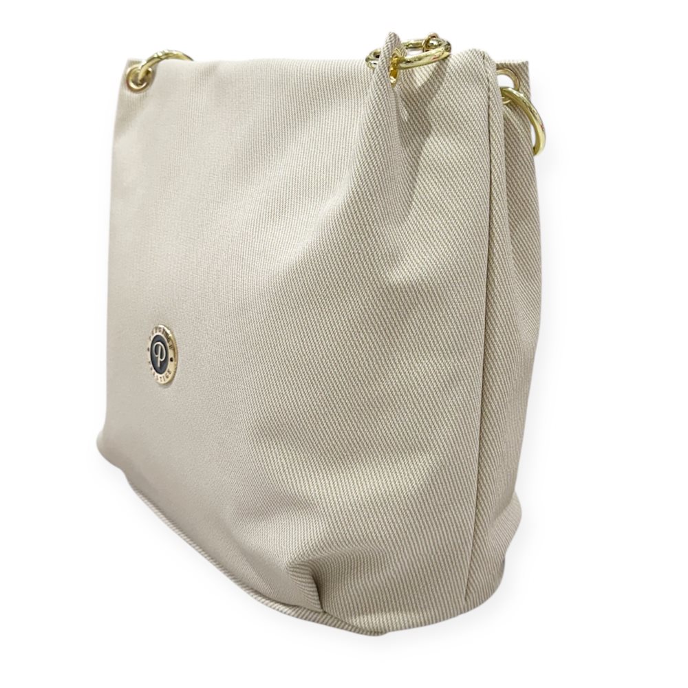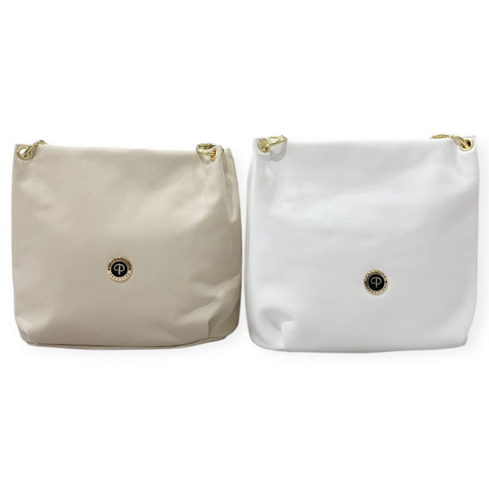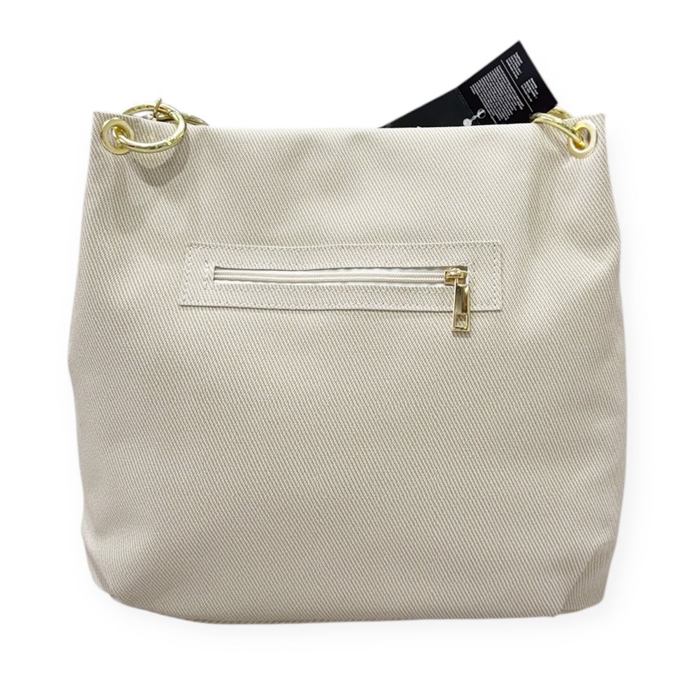 Divatos válltáska. Egy rekeszes. Anyaga:  rostbőr Származási hely: Lengyelország Szín: krém,fehér. Méret: Szé 33 x Ma 31 x Mé 14 cm