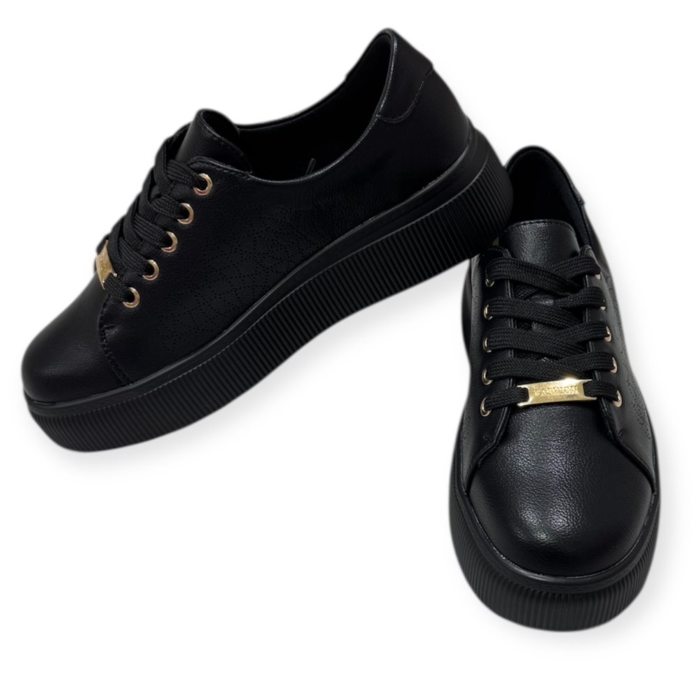 Divatos sneaker sportcipő. Anyaga: szintetikus. Származási hely: EU Szín: fekete  Talp magasság: 3 cm Sarok magasság: 4,5 cm Méret:  36- 23 cm 37- 23,5 cm 38- 24 cm 39- 24,5 cm 40- 25 cm 41-25,5 cm