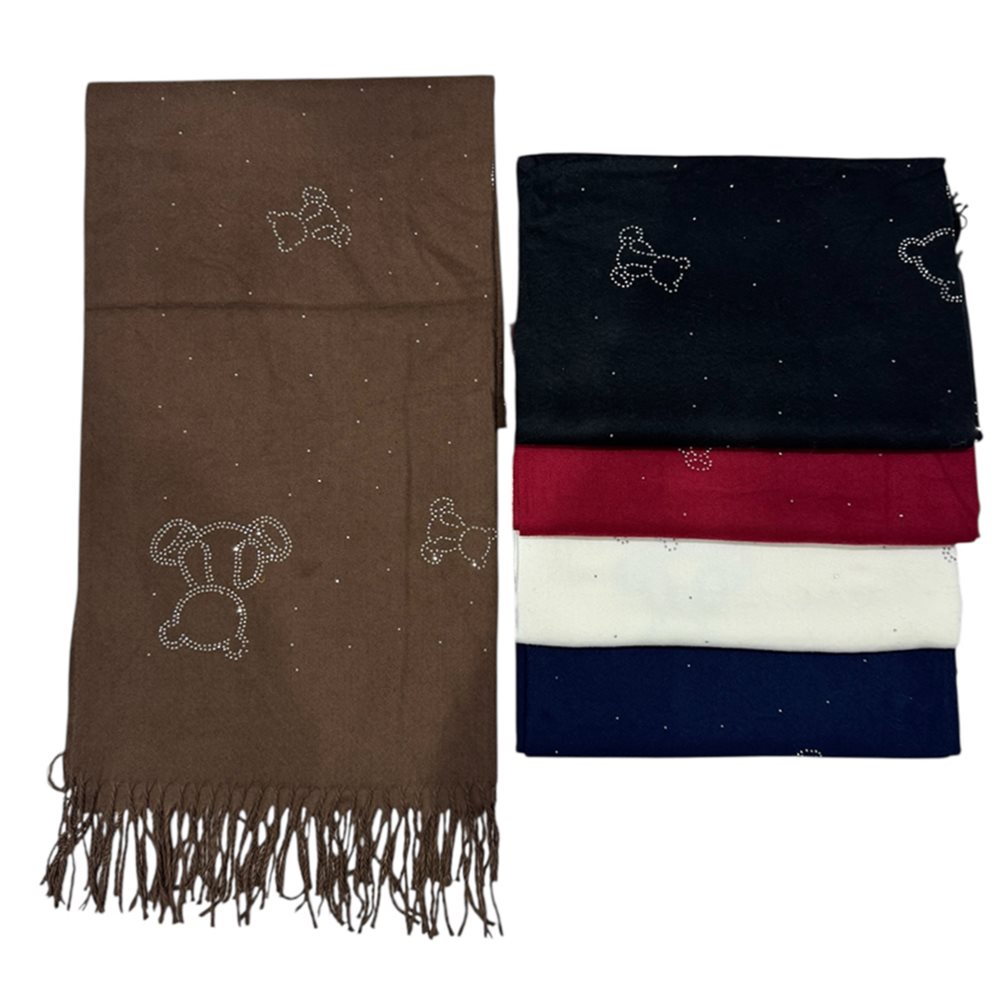 Divatos straszkövekkel díszített sál,könnyű puha anyagú.Származási hely: EU Anyaga: 80% viszkoz 20% gyapjú  Szín: fekete,fehér,bordó,csokibarna,kék.