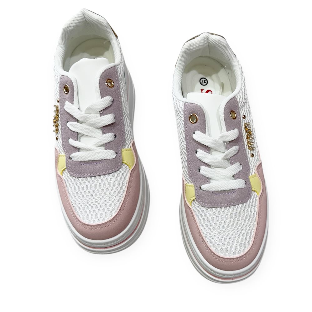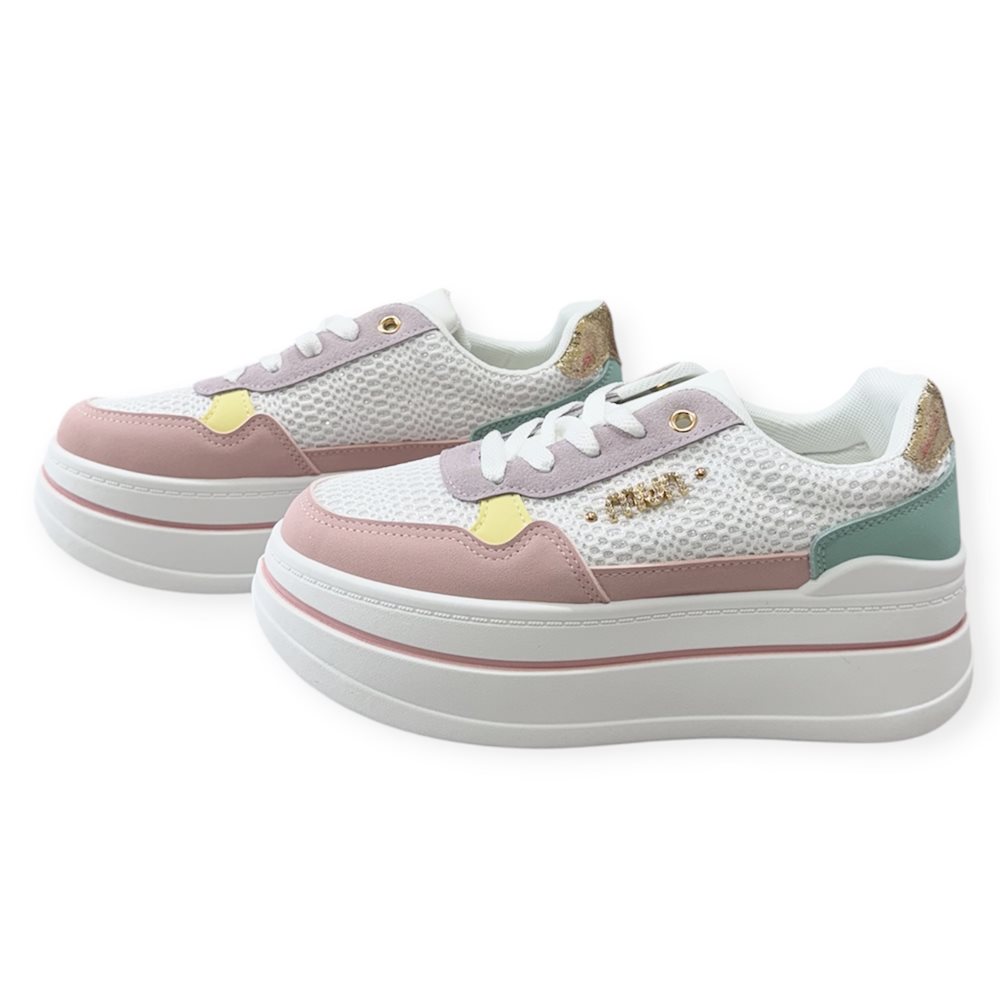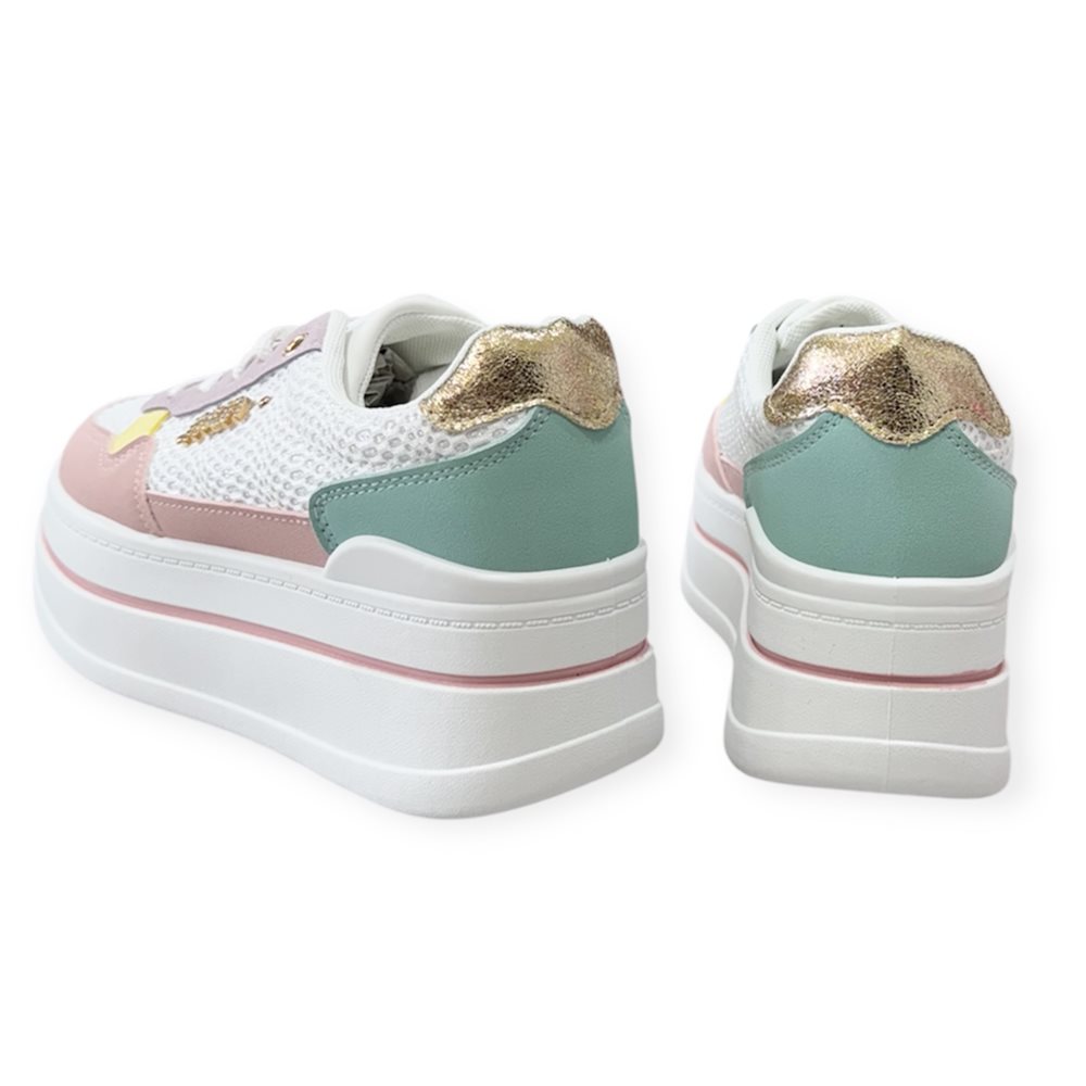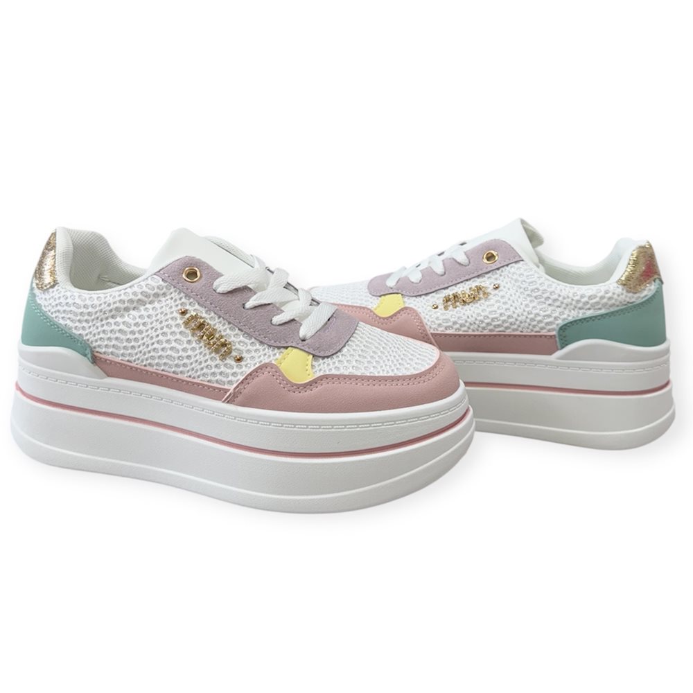 Divatos emelt talpú sportcipő. Anyaga: szintetikus Származási hely: EU Szín: fehér/színes. Talp magasság: 4,5 cm Sarok magasság: 5,5 cm Méret: 36- 23 cm 37- 23.5 cm 38- 24 cm 39- 24.5 cm 40- 25 cm 41-25.5 cm
