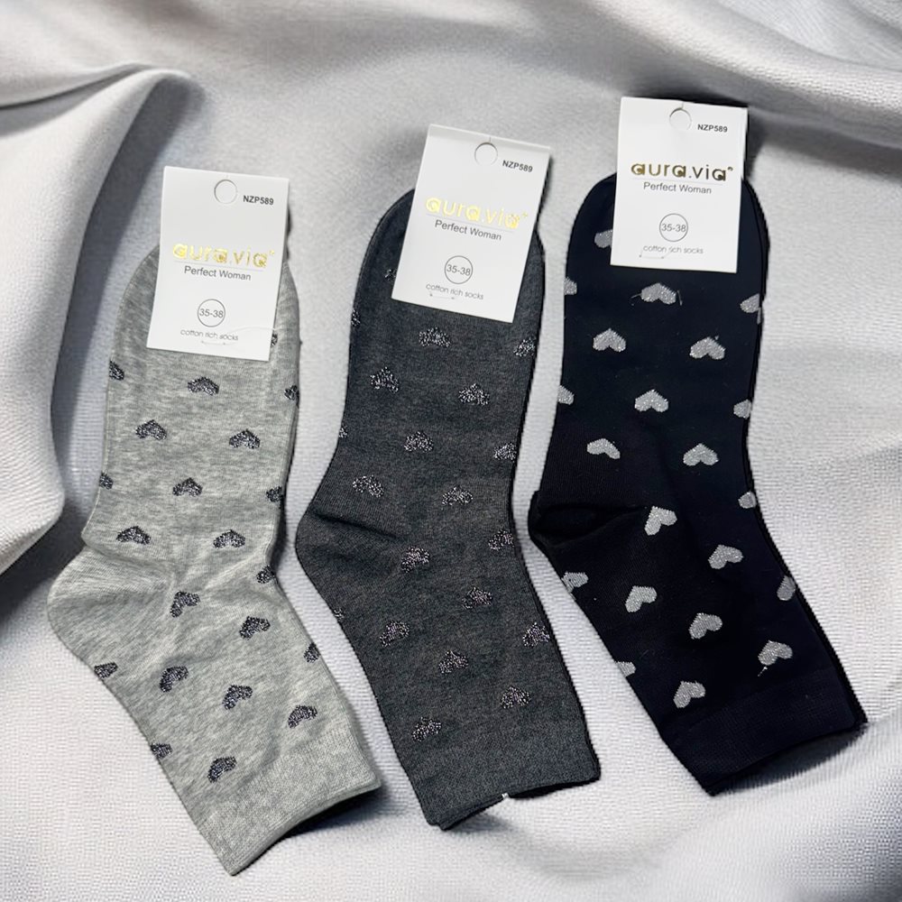 Kényelmes pamut  zokni,csillogó ezüst szállal díszítve a szivecskék. Anyaga: 85%pamut, 10% poliamid, 5 % elastan Ápolás: Gépben mosható. Szín: grafit,világos szürke,fekete. Származási hely: EU