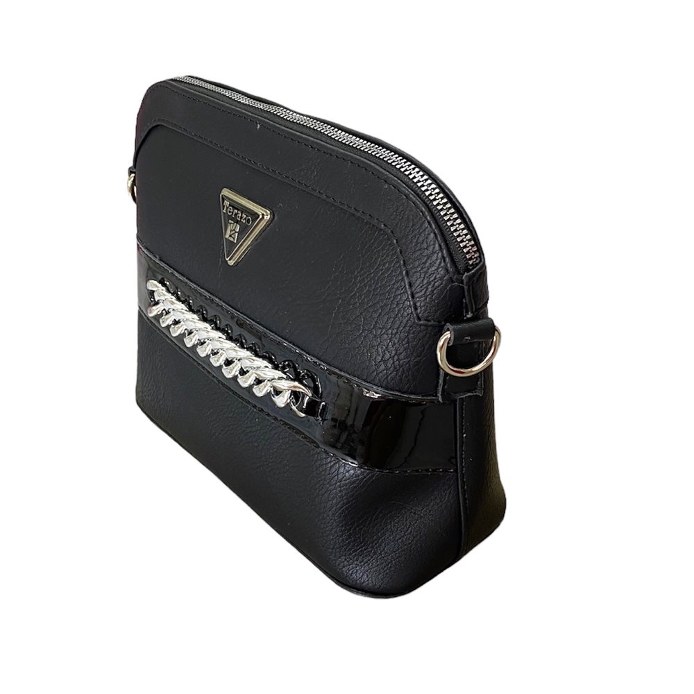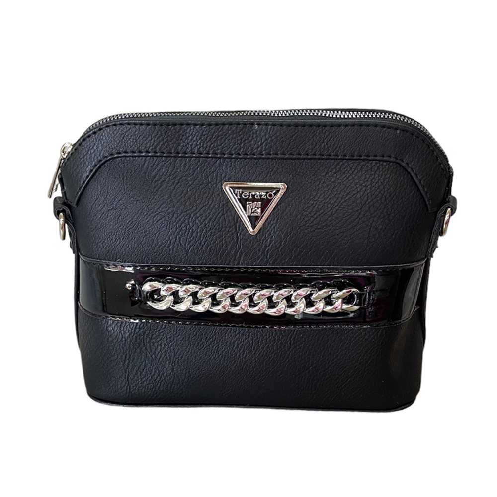 Divatos oldaltáska.Egy rekeszes,elöl és hátul cipzáras zseb,az oldal bővíthető a cipzár segítségével. Anyaga: steppelt Származási hely: Lengyelország Szín: fekete/bronz. Méret: Szé 26,5 x Ma 28 x Mé 2,5-7 cm