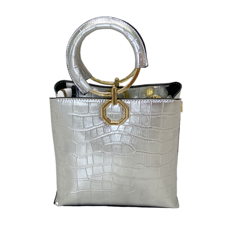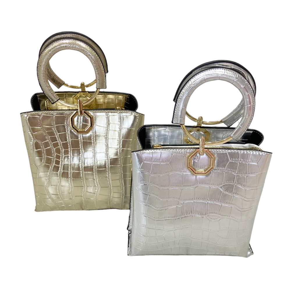Elegáns kézitáska. Két rekeszes,plusz hosszú pánt. Anyaga: rostbőr Származási hely: Lengyelország Szín: ezüst,arany Méret: szé 28,5 x ma 20 x mé 10 cm
