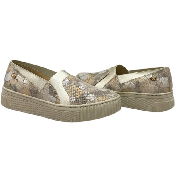 Divatos bőr slip on. Anyaga: Bőr Származási hely: Lengyelország Szín: arany mintás Talp vastagság: 3 cm Sarok magasság: 4 cm Méret: 36- 23 cm 37- 23,5 cm 38- 24,5 cm 39- 25 cm 40-25,5 cm