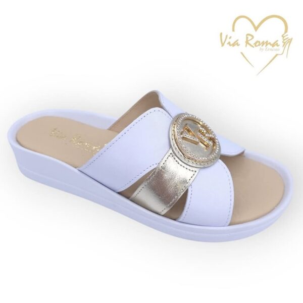 Divatos,elegáns bőr papucs. Származási hely: Lengyelország Anyaga: bőr Szín: fehér-arany Sarok rész: 4 cm Talp rész: 2 cm Méretek: 36- 22,5 cm 37- 23 cm 38- 23,5 cm 39- 24,5 cm 40- 25 cm