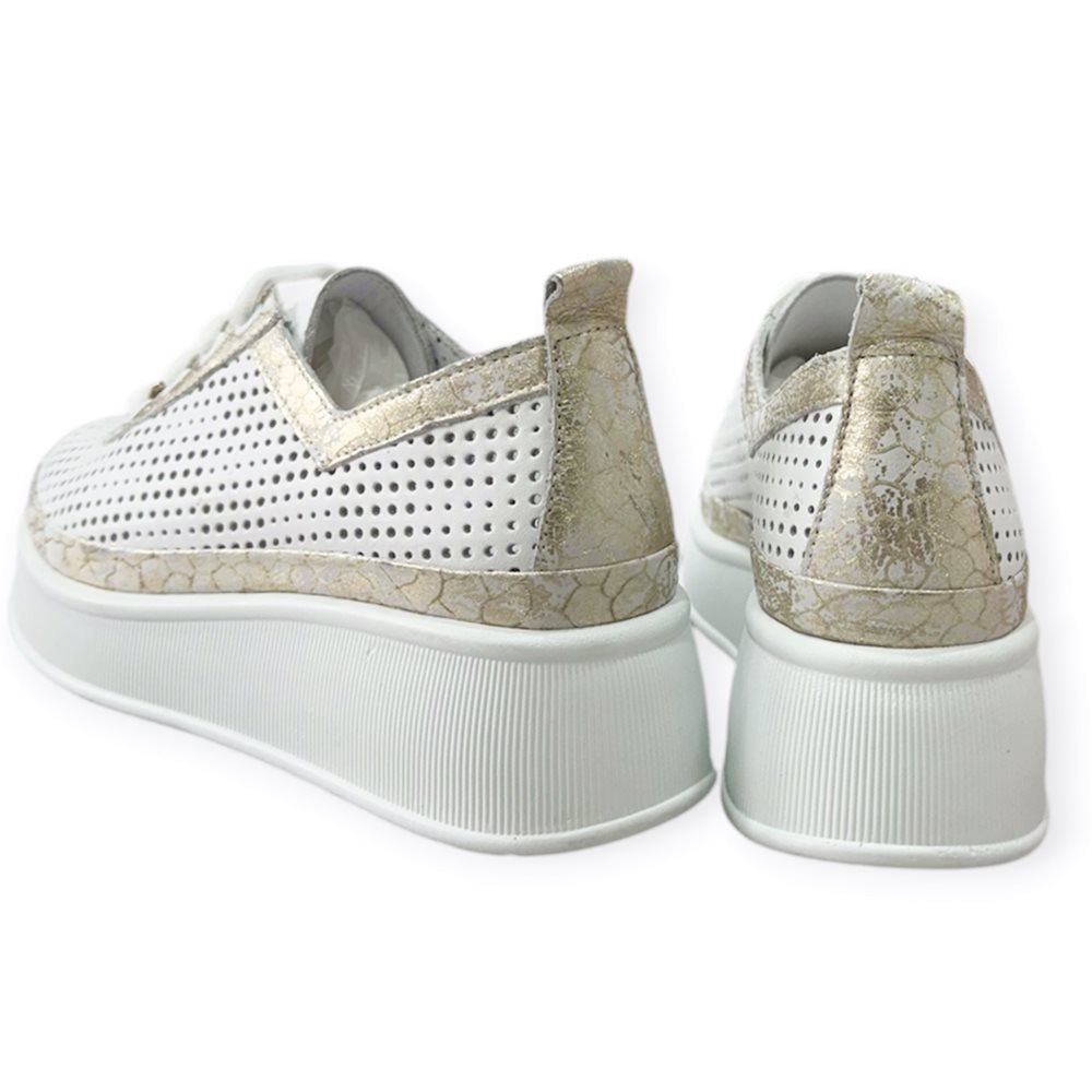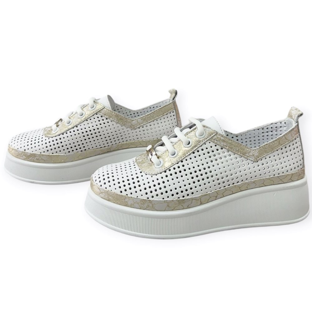 Divatos fűzős bőr lyukacsos sneaker/sportcipő. Anyaga: eredeti bőr Származási hely: Lengyelország Szín: fehér- arany Talp vastagság: 3 cm Sarok magasság: 5 cm Méret: 36- 23 cm 37- 23,5 cm 38- 24,5 cm 39- 25 cm 40-25,5 cm