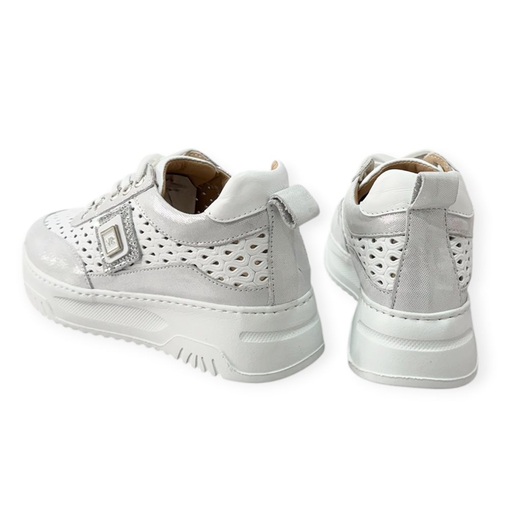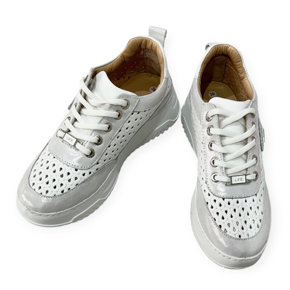 Divatos fűzős bőr lyukacsos sneaker/sportcipő. Anyaga: eredeti bőr Származási hely: Lengyelország Szín: fehér-ezüst Talp vastagság: 2,5 cm Sarok magasság: 4 cm Méret: 36- 23 cm 37- 23,5 cm 38- 24,5 cm 39- 25 cm 40-25,5 cm