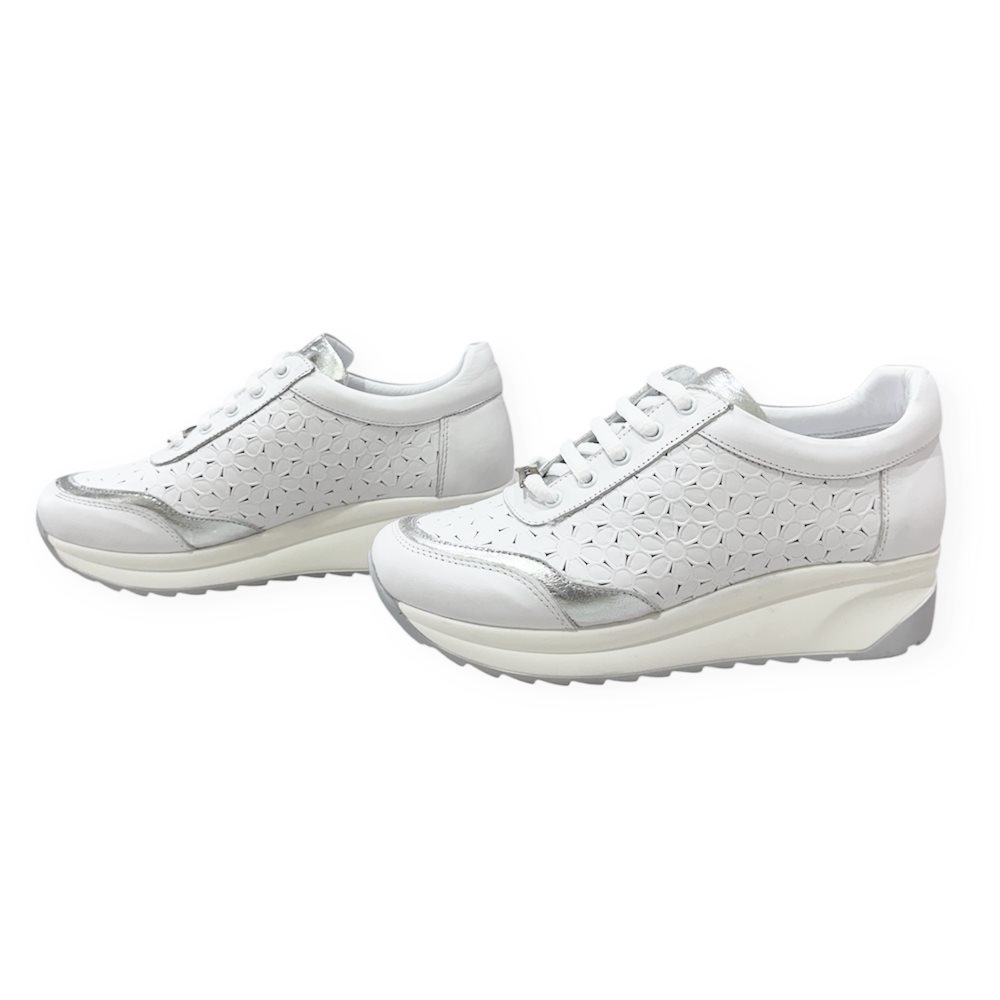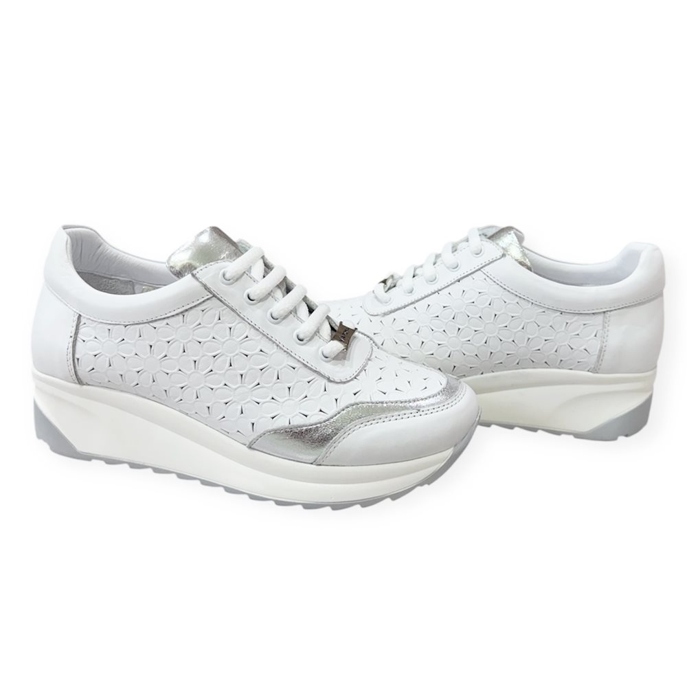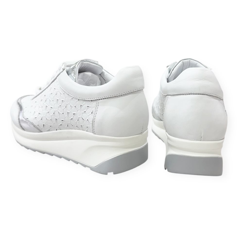 Divatos,bőr sneaker,sportcipő,lézervágott mintával. Anyaga: eredeti bőr Származási hely: Lengyelország Szín: fehér-ezüst Sarok magasság: 4 cm Talp vastagság: 2 cm Méret: 35-22,5 cm 36- 23 cm 37- 24 cm 38- 24,5 cm 39- 25 cm 40- 25,5 cm