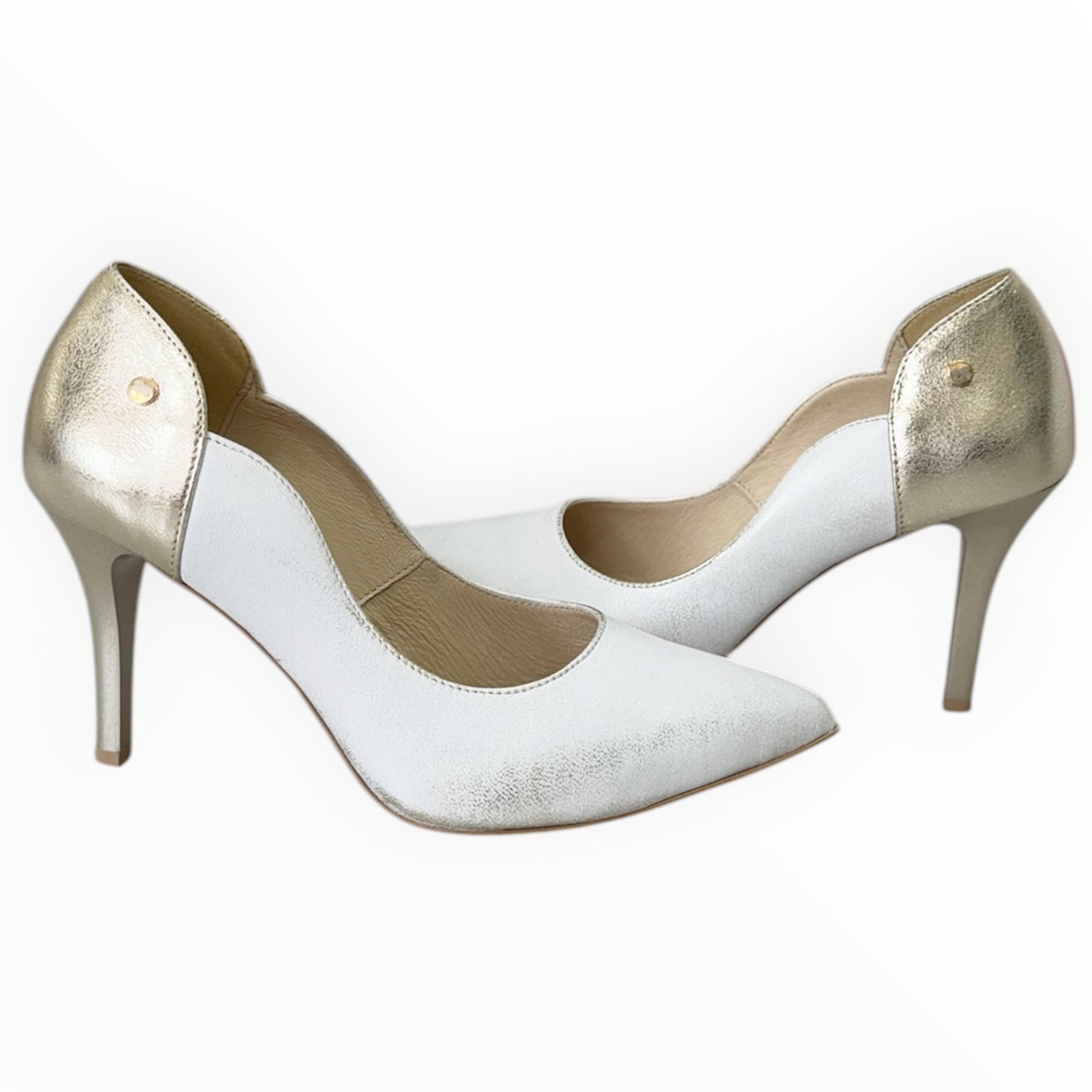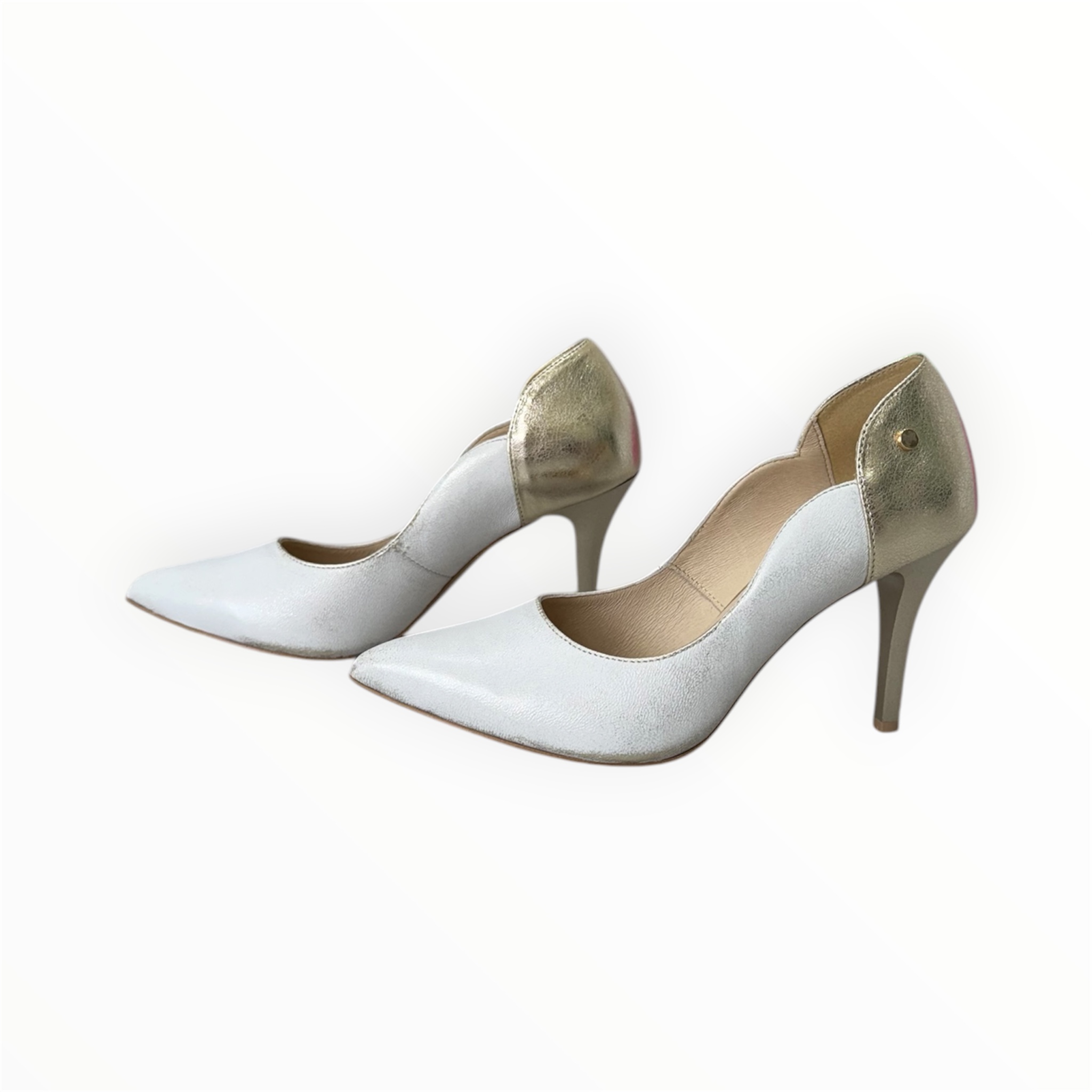 Divatos bőr magassarkú,kényelmes talpbetéttel. Anyaga: eredeti bőr Származási hely: Lengyelország Szín: koptatott arany-arany.  Sarok: 8,5 cm Méret: 35- 23 cm 36- 23,5 cm 37- 24 cm 38- 24,5 cm 39- 25,5 cm 40- 26 cm