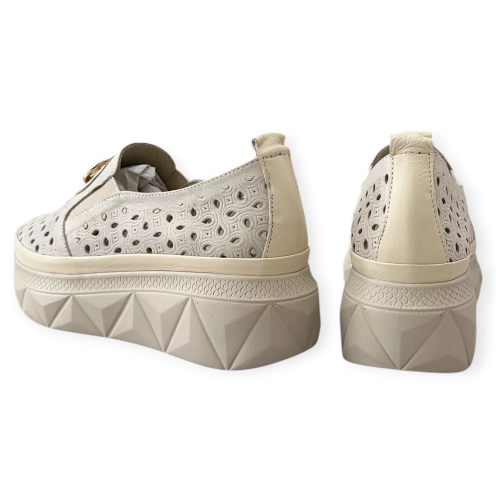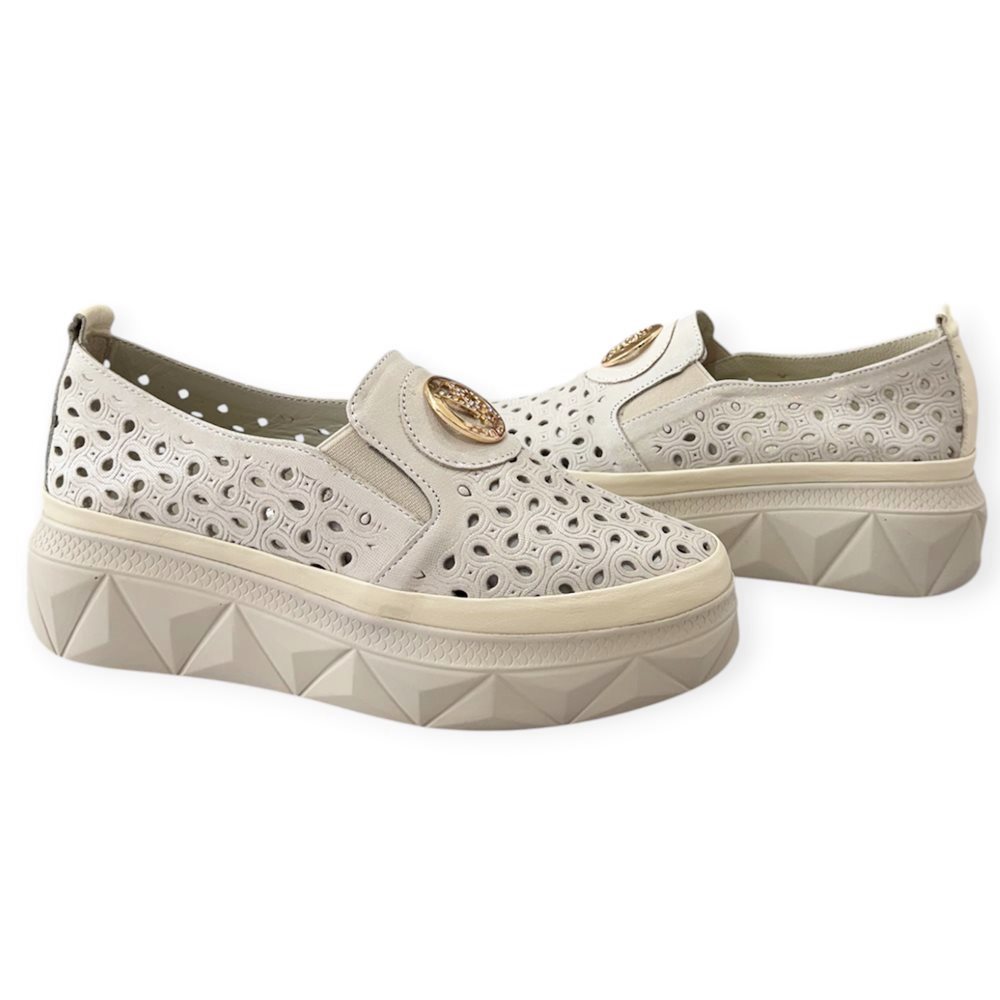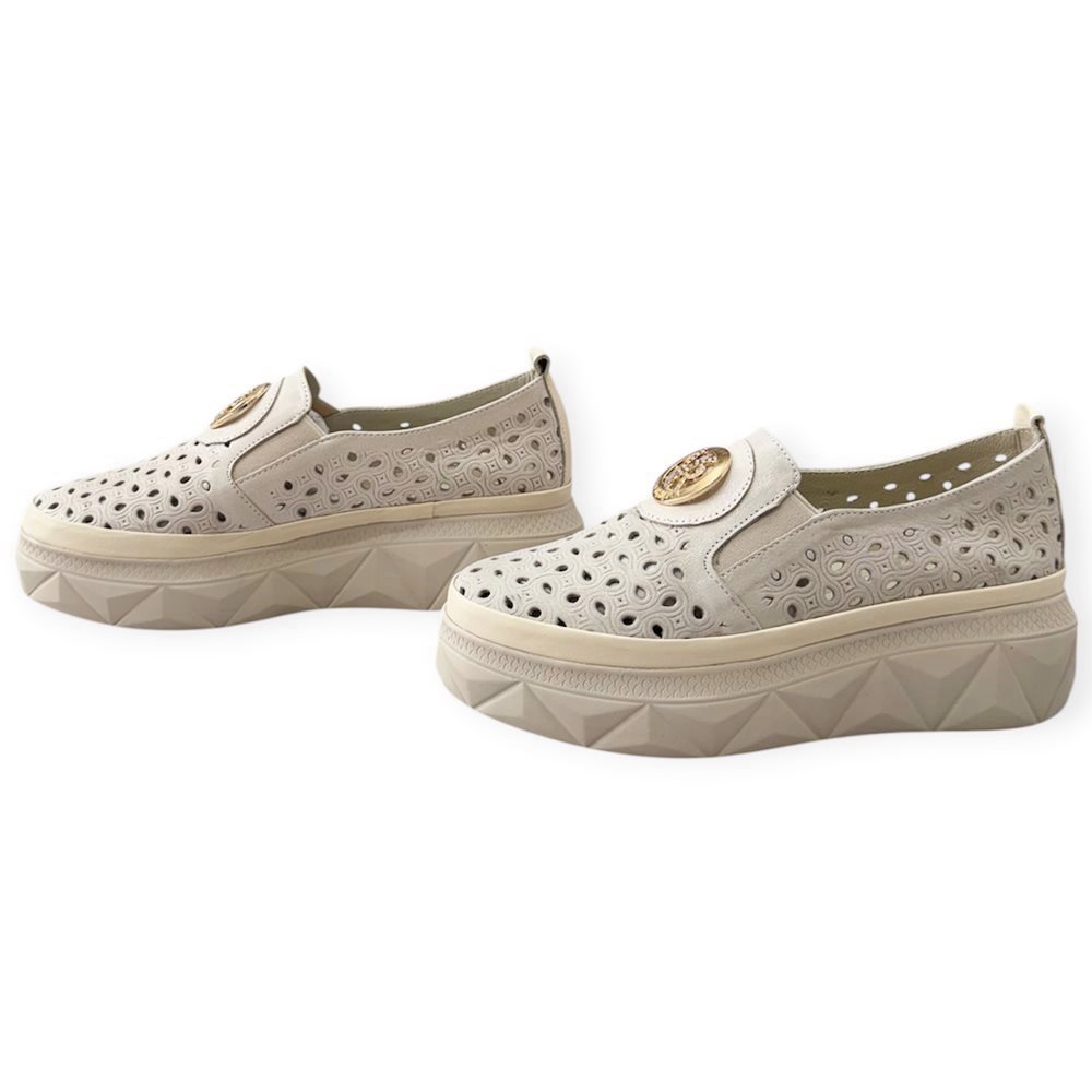 Divatos lyukacsos bőr slip on. Anyaga: eredeti bőr Származási hely: Lengyelország Szín: krém-bézs. Talp vastagság: 3 cm Sarok magasság: 5 cm Méret: 36- 23 cm 37- 23,5 cm 38- 24,5 cm 39- 25 cm 40-25,5 cm