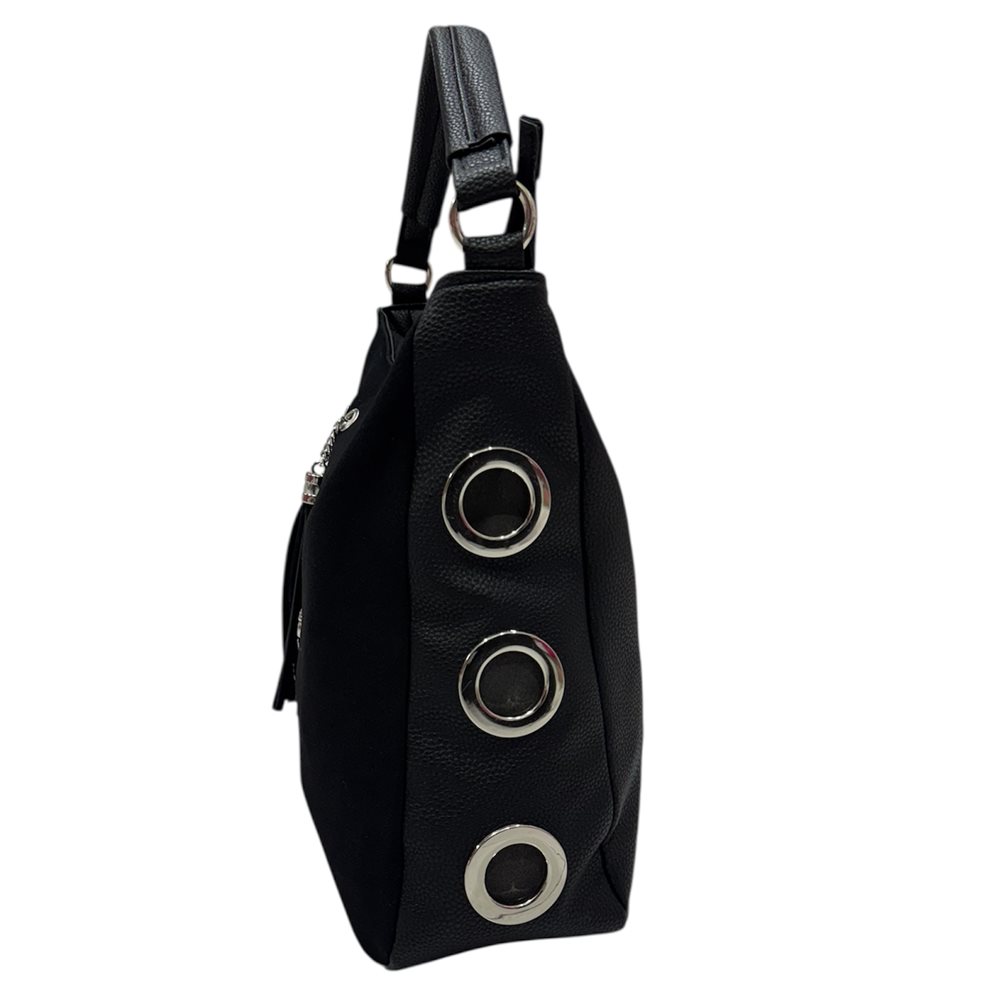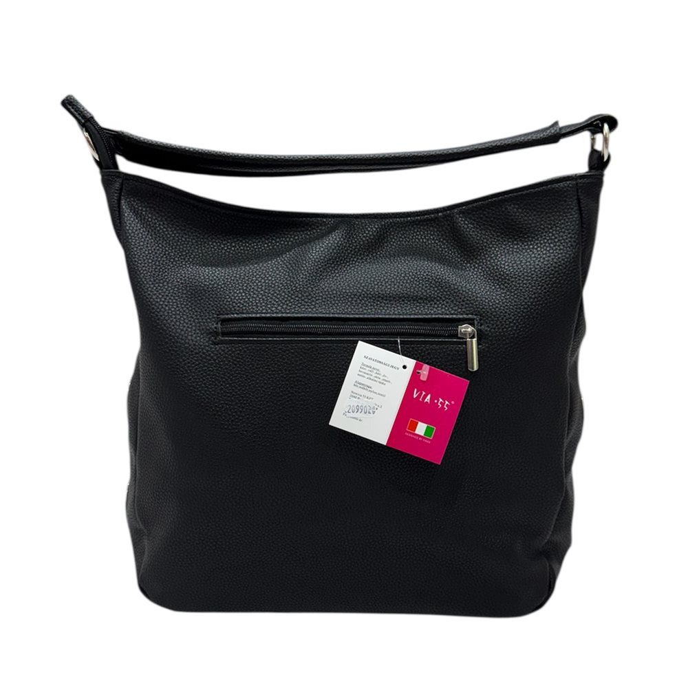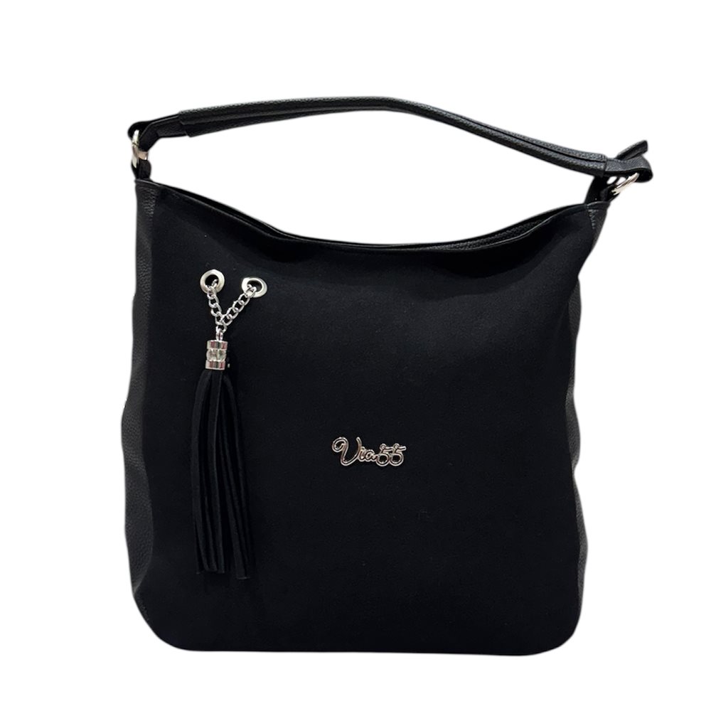 Divatos válltáska. Egy rekeszes,plusz hosszú pánt. Anyaga: rostbőr Származási hely: EU Szín: fekete-nubuk /ezüst logo/. Méret: Szé 31 x Ma 32 x Mé 14 cm