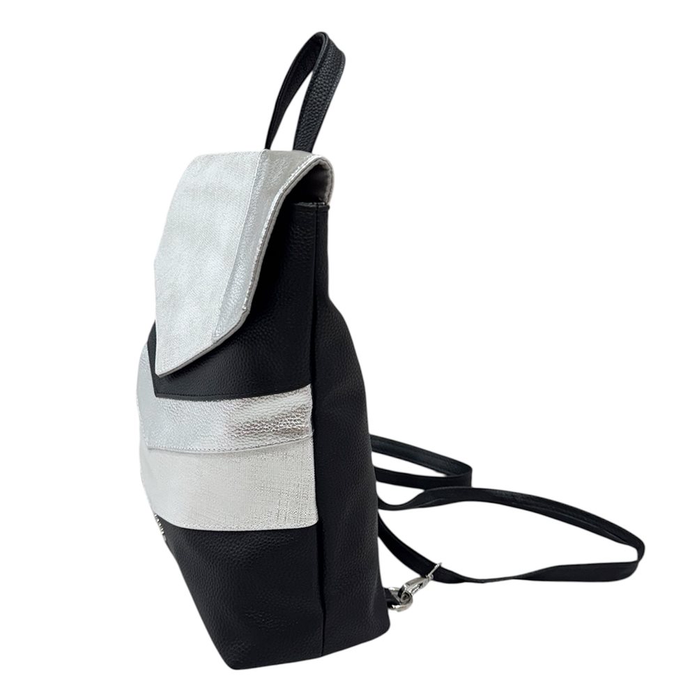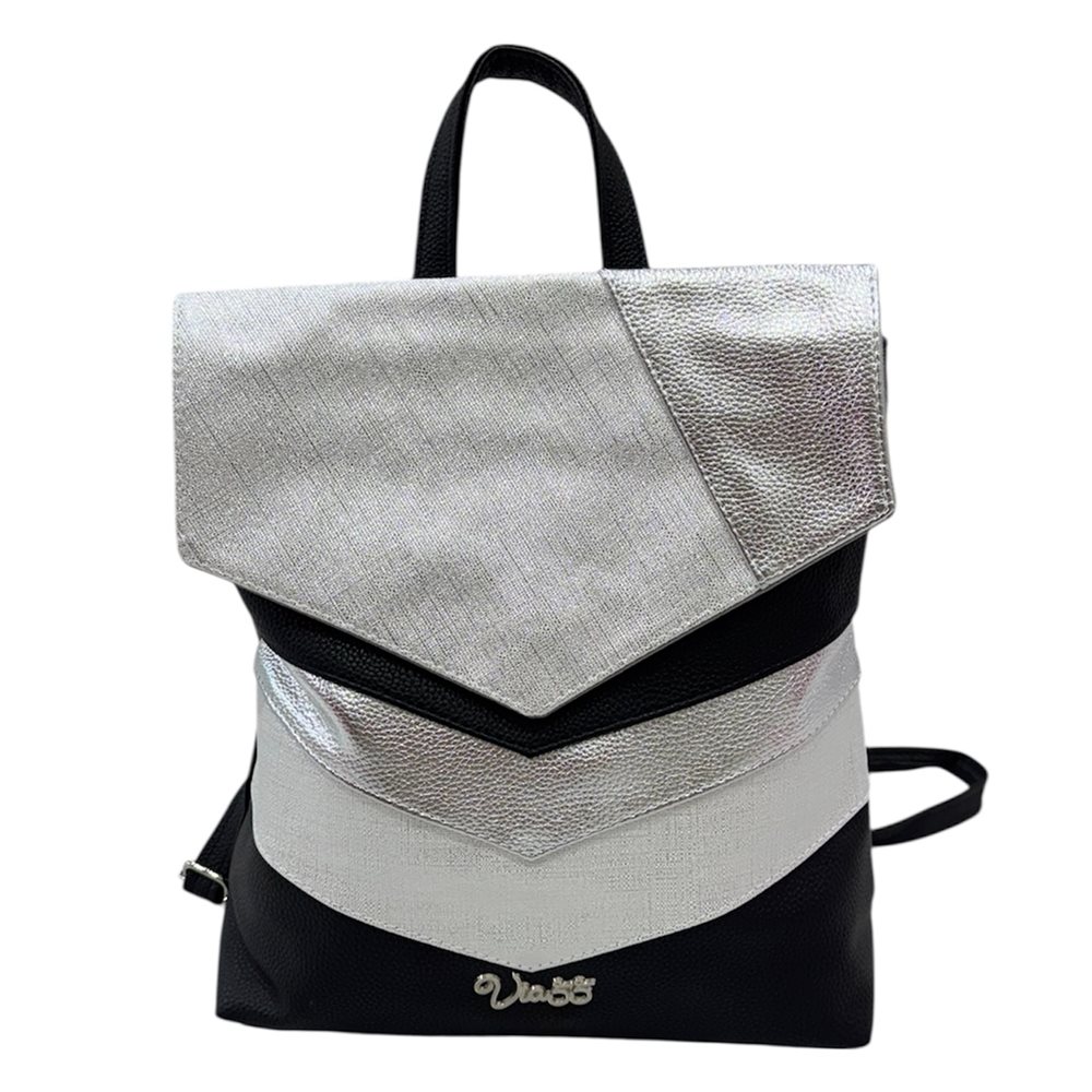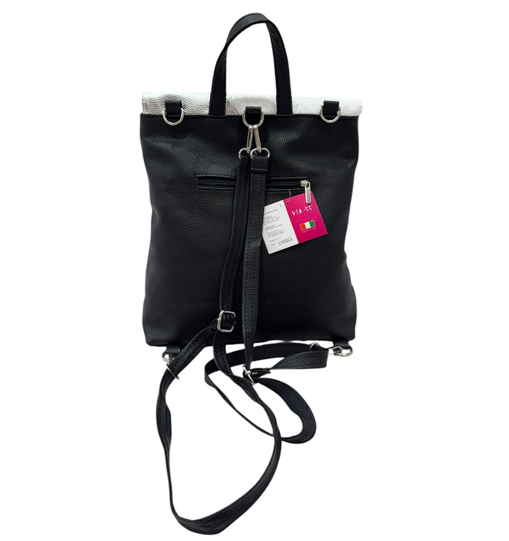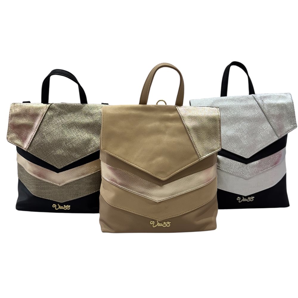 Divatos kézi-váll-hátitáska. Egy rekeszes. Anyaga: rostbőr Származási hely: EU Szín: fekete-ezüst,fekete-arany,bézs-arany. Méret: Szé 28,5 x Ma 31 x Mé 11,5 cm