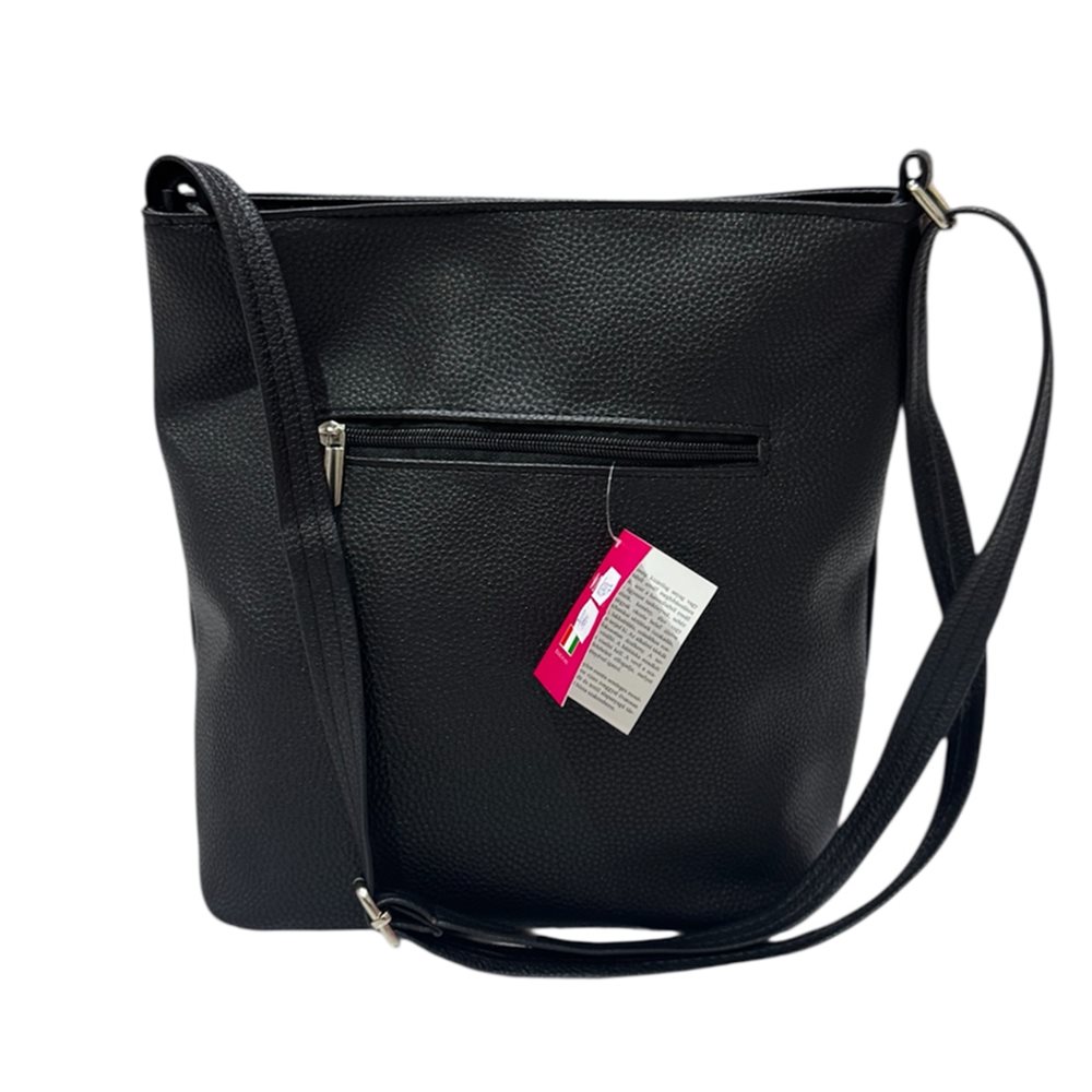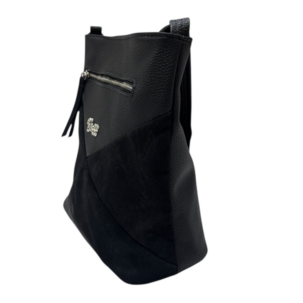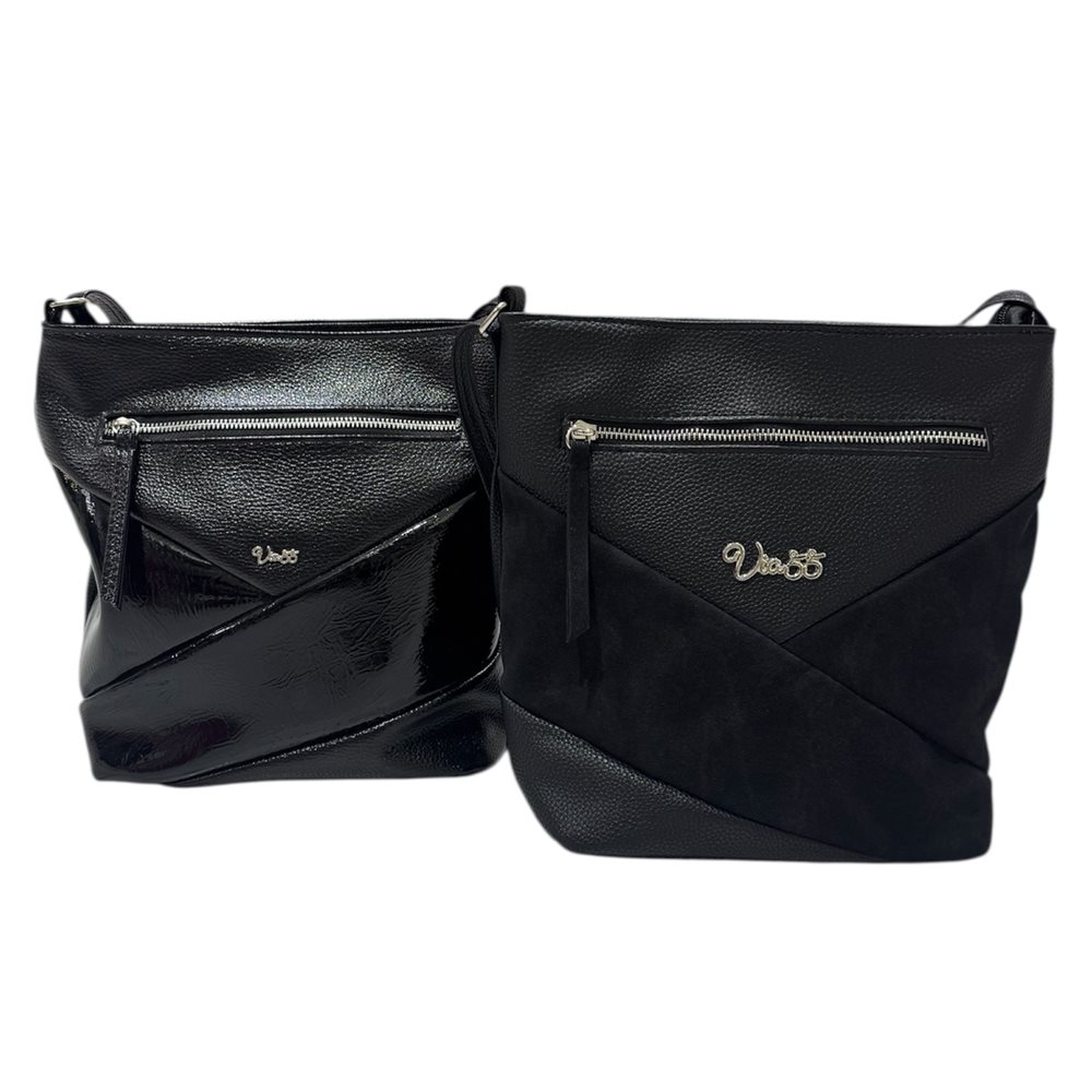 Divatos oldaltáska.Két rekeszes,elöl és hátul cipzáras zseb. Anyaga: rostbőr Származási hely: EU Szín: fekete-fényes,fekete-nubuk. Méret: Szé 28 x Ma 27 x Mé 11,5 cm